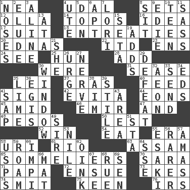 ACROSS 1. Teachers' org. 4. Hereditary estate 8. Arranges properly for use 12. Water jar 14. Traditional theme or motif 16. The main thing one is thinking about 17. Set of matching outer garments 18. Pleas 20. Ferber et al. 22. It would 23. Followers of ems 24. Perceive with the eye 25. Attila the _ 28. Say or write further 30. Past tense of be (plural) 31. Gospel singer Marvin 35. Luau accessory 37. Pate de foie ____ 40. Nourish 41. Public display of a written message 42. Webber/Rice musical 44. Immeasurably long periods of time 45. Among 46. Independent ruler or chieftain 47. Also 48. Mexican monetary units 50. For fear that 52. Acquire through effort 54. Ingest 55. Period 58. RI univ. 61. _ de Janeiro 63. Indian state 65. Wine waiters 70. "Two Mules for Sister ____" 71. Dad 72. Follow as a consequence or result 73. Makes supply last 74. Stricken, poetically 75. Peachy ____! 76. Big collection agency DOWN 1. Olfactory organs 2. Dodge 3. Place in a line 4. Shoshoni 5. Spanish title 6. Fitting 7. Australian parrot (variant) 8. Be seated 9. Singer Brickell 10. Adolescent 11. Backtalk 13. "One Day ___ Time" 15. Bristle 19. Sums up 21. A female animal or person 26. Goad 27. Effrontery 29. Outscore 30. Light entry point 32. A really long time 33. Post 34. Begley and Asner 35. Citrus frut 36. The front part of a cuirass 38. Direct toward a target or goal 39. Vertical member of a panel or frame 41. Plant excrement 43. Length times width 49. The founder of a family 51. R.R. building 53. The longest river in the world 55. 1973 Nobel Price Winner (Physics) Leo 56. More uncommon 57. Collect or gather 58. United States Postal Service (abbr.) 59. Wander 60. Body of Kaffir warriors 62. Pig sound 64. Compass dir. 66. Floor protector 67. Compass dir. 68. Regret 69. Elected rep.
