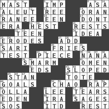ACROSS 1. Vertical spar for supporting sails 5. Mischievous child 8. White ___ sheet 11. Native American of Southwest Alaska 13. To riddle 14. Northwest Algerian city 15. The wife of a rajah (variant) 16. Car or cant ending 17. Do not 18. Period 19. Command 21. Musical pauses 22. Adolescent 24. The main thing one is thinking about 25. Eats (away) 27. Increase 29. Indian skirt 30. Strips of potato fried in deep fat 32. Trial 33. Component 35. Grandmother 39. Excessive but superficial compliments 41. Presage 42. Begley and Asner 43. Inclined 45. Comedian Laurel of Laurel & Hardy 48. Haul 49. Purposes of endeavors 50. US Secretary of Labor Elaine L. _ 52. Strike 55. Rounded earthenware pot or jar 56. Area sheltered from the wind 57. Rends 59. Paradise 60. Lyricist Gershwin 61. Gurus 62. Distress signal 63. It would 64. Relief DOWN 1. Female horse 2. Having or resembling wings 3. Elected representatives 4. Third day of the wk. 5. Angers 6. Rendezvous 7. Writing instrument 8. Came up 9. Before Barbara or Clara 10. Pismires 12. Giggle 14. Wrote a lyric poem 20. Followers of ems 21. Travel on or in a vehicle 23. Proofreads 25. Eastern Standard Time (abbr.) 26. Actress Charlotte 27. Curve 28. Expire 30. Opposite of masc. 31. Snob 33. Writing tablet 34. Big collection agency 36. Electrical Measurement 37. Born 38. Added to 40. Not women's 43. R.R. building 44. Plunders 45. Twentieth part of a lira 46. Stories 47. ____ Jay Lerner 49. Travels 50. Sure thing 51. Froth on beer 53. Ancient Greek god of war 54. Inconspicuous attention getter 56. Cards in a Roman deck? 58. Ewer handle