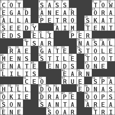 ACROSS 1. Small bed 4. Backtalk 8. Pull behind 11. Mild oath 13. Approach 15. Mouth or opening 16. Silent film actress Nazimova 17. Stone: prefix 18. Three-handed card game 19. Sleazy 21. Direct toward a target or goal 22. Portable shelter 23. Begley and Asner 24. Connecticut Ivy Leaguer 27. For each 29. Russian ruler of old 30. Relating to the nose 34. Actress Charlotte 36. Yard entry 39. Fur scarf 40. Not women's 41. Vertical member of a panel or frame 43. A blast of a horn 44. Maternal 46. Extremities 47. Single 48. Ms. Damita and namesakes 49. Merit 51. Corporate head (abbr.) 53. Regret 54. Health resort 57. Land elevation 60. Spanish title 63. Ferber et al. 65. Migrant worker of the '30s 66. Window treatment 69. I made a mistake 70. Male offspring 71. Before Barbara or Clara 72. Length times width 73. Compass dir. 74. Fly high 75. Three (prefix) DOWN 1. Desist 2. Stared at amorously 3. Lies 4. Plant excrement 5. One (Scot) 6. Stalk of a moss capsule 7. Indian skirt 8. Casino tip 9. Northwest Algerian city 10. Electrical Unit 12. June honoree 14. Frolic 18. Ski resort town in Vermont 20. Affirmative reply 25. Straggles 26. Feeling or showing extreme anger 28. Followers of ems 29. One of the two male reproductive glands 31. Within a short period 32. Medicinal plant 33. Allow 34. Painter Guido (1575-1642) 35. Of or related to the anus 37. Metal container 38. A person who is older than you are 40. Cartoonist voice _ Blanc 42. He sold his birthright 45. Compass dir. 50. To riddle 52. Probability 54. Derisive sound 55. Some stationery 56. Slender Brazilian palm 57. Stockings 58. Visual representation of an object 59. Actor's bit 61. Mouths or openings 62. Billionth: prefix 64. ___ good deed 67. Parent Teacher Assoc. 68. Hearing organ