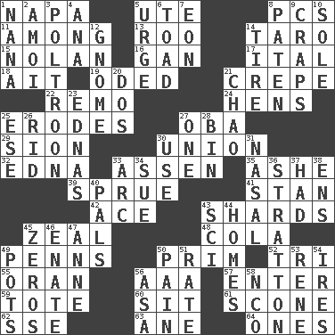 ACROSS 1. California wine valley 5. Shoshoni 8. Personal Computers (abbr.) 11. Amid 13. Friend of Pooh 14. Edible starchy tuberous root 15. Pitcher Ryan 16. Separate the seeds from cotton 17. Slanted text style (abbr.) 18. Small island 19. Wrote a lyric poem 21. Streamer paper 22. San ____ (Riviera town) 24. Coop moms 25. Eats (away) 27. Chief or king in Benin or Nigeria 29. The Jewish people; Israel 30. The state of being joined or united 32. Pulitzer Prize-winning author Ferber 33. NE Netherlands city 35. American tennis player Robert 39. Upset 41. Comedian Laurel of Laurel & Hardy 42. Adept person 43. Pottery fragments 45. Ardor 48. Root beer relative 49. Actor Sean's family 50. Demure 52. Three (prefix) 55. NW Algerian seaport 56. Auto club (abbr.) 57. Keyboard key 59. Carry 60. Be seated 61. Biscuitlike quick bread 62. Compass dir. 63. A saturated hydrocarbon 64. Washington bills DOWN 1. Grandmother 2. Mine, in Marseilles 3. Coward 4. Santa ___, CA 5. Goad 6. Frog relative 7. Period of immesurable duration 8. Eucharist need 9. Dice game 10. Not divided or shared with others 12. Dwarf 14. Hoop that covers a wheel 20. Two (Sp.) 21. US Secretary of Labor Elaine L. _ 23. Ferber et al. 25. Compass dir. 26. To free from 27. Single 28. Storage container 30. Purpose 31. Rhinal 33. Curve 34. Take to court 36. Ski resort town in Vermont 37. Possessed 38. Followers of ems 40. Friends 43. _-fi 44. Dwellings 45. Nothings 46. Related on the mother's side 47. Singer Murray 49. Cooking vessels 50. Ache 51. Pace 53. French philosopher Descartes 54. Angers 56. White ___ sheet 58. Non-commissioned officer (abbr.)