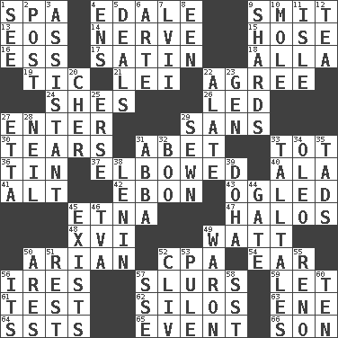 ACROSS 1. Health resort 4. Peak District village in England 9. Stricken, poetically 13. Greek goddess of the dawn 14. Impudent aggressiveness 15. Flexible conduit 16. Curvy letter 17. Smooth fabric 18. Silent film actress Nazimova 19. Nervous spasm 21. Flowery wreath 22. Match 24. "______ My Girl" (Turtles hit) 26. Directed 27. Keyboard key 29. Without 30. Pulls into pieces 31. Collude with 33. Small child 36. Shallow baking pan 37. Shoved, as through a crowd 40. Wing 41. Keyboard modifier key 42. Inky black, to poets 43. Stared at amorously 45. Inactive volcano in Sicily 47. Radiant circles of light 48. 16 49. Electrical Unit 50. Believer in; advocate of (suffix) 52. Tax preparer (abbr.) 54. Hearing organ 56. Angers 57. Plays smoothly or legato 59. Allow 61. Trial 62. Grain storage towers 63. Compass dir. 64. Fast planes 65. Incident 66. Male child DOWN 1. Perceive with the eye 2. Mail 3. Helper 4. Followers of ems 5. Allots cards 6. Johnson of "Laugh-In" 7. 57 in ancient Rome 8. Car or cant ending 9. Pottery fragments 10. Undercover agent 11. Small island 12. Beverage made from leaves 20. "Mermaids" star 22. Having winglike extensions 23. Commissioned mil. rank 25. Celtic language 27. Singer James 28. Famous astronaut Armstrong 29. Stitched 31. Swedish rock group 32. Sometimes accompanies a hiss 33. Baron Munchausen's specialties 34. Butter sub 35. Small boys 38. Soviet premier 1918-24 39. Capital of the state of Qatar 44. Yard entry 45. Is extant 46. Federal power corp. 49. Make _____ (do battle with) 50. Ancient Greek god of war 51. Relief 52. 154 in Roman numerals 53. Whine 55. Former U.S. Attorney General Janet 56. ___ a Wonderful Life 57. Compass dir. 58. Fast jet (abbr.) 60. "___ Little Indians"