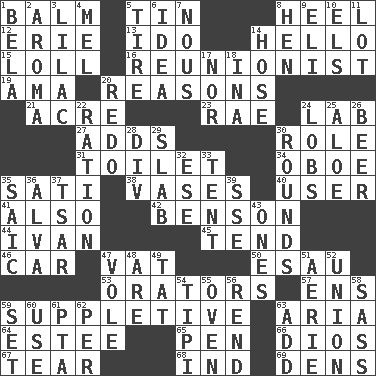 ACROSS 1. Lip ointment 5. Shallow baking pan 8. The bottom of a shoe or boot 12. 4th largest of the Great Lakes 13. Wedding promise 14. Phone greeting 15. Hang loosely or laxly 16. One who advocates reunion 19. Nursemaid (var.) 20. Thinks logically 21. Land measure 23. Actress Charlotte 24. Experiment locale 27. Sums up 30. Hero or heavy, e.g. 31. Bathroom 34. Mitch Miller's instrument 35. Suttee (variant) 38. Flower holders 40. One who makes use of a thing 41. In addition 42. Gillaume's butler role 44. _ the terrible 45. Be inclined (to) 46. Automobile 47. Large container 50. Son of Isaac 53. Speakers 57. Followers of ems 59. Supplying deficiencies 63. Operatic vocal solo 64. First name in cosmetics 65. Writing instrument 66. "Vaya con ____" 67. Pull into pieces 68. Indiana (abbr.) 69. Habitations of wild animals DOWN 1. Actor Lugosi 2. Scent 3. Pale purple color 4. Cartoonist voice _ Blanc 5. Become fatigued 6. The content of cognition 7. Common sense 8. Layer 9. Biblical high priest 10. Raised railways 11. Car dealer's back yard 14. Flexible conduit 17. Not either 18. _ tizzy (2 wds.) 20. Do over again 22. Food allowance for one day 24. Tennis shots 25. Medicinal plant 26. Fermented drink made from hops 28. HTML Container Element 29. Thick slice 30. Periods in a boxing match 32. Compass dir. 33. Portable shelter 35. Ketch in the Levant 36. Inventor's middle name 37. Russian ruler of old 39. Compass dir. 43. Washington bills 47. Short-tailed, large-bodied rat 48. "We ___ not amused" (Victoria) 49. Make lace 51. Nest on high 52. The state of being joined or united 54. Native american tent (variation) 55. Baking chamber 56. Tear apart 58. Backtalk 59. Put into a specified state 60. Purpose 61. Parent Teacher Association (abbr.) 62. For each 63. Find the sum of