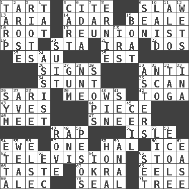 ACROSS 1. Small pie 5. Quote 9. Cole _ (cabbage dish) 13. Roberta Peters solo 14. The sixth month of the Jewish calendar 15. Calif. Air Force Base 16. Carrot, for example 17. One who advocates reunion 19. Pacific Standard Time (abbr.) 20. R.R. building 21. Retirement account (abbr.) 22. Two (Sp.) 23. Son of Isaac 25. Eastern Standard Time (abbr.) 26. Omens 30. Against 34. Check the growth or development of 35. Examine hastily 36. Indian skirt 39. Catcalls? 42. Ancient Roman robe 43. Jacques Cousteau's middle name 44. Component 46. Confront 47. Contemptuous expression 48. Reproach for some lapse or misdeed 51. Capri or Wight 54. She-sheep 57. Single 58. Actor Linden 60. Frozen water 62. Household entertainment appliance 65. Portico 66. Clothes sense 67. Gumbo ingredient 68. Snakelike fish 69. Actor Baldwin 70. Lick closed 71. Relationship diagram DOWN 1. Canvas cover 2. Came up 3. Disturbances 4. Make lace 5. Haul 6. It may be bright or harebrained 7. The 19th letter of the Greek alphabet 8. Bert's buddy 9. Elected rep. 10. Put down 11. In addition 12. Moistens 15. Water vessel 18. Big collection agency 20. Set or collection 24. Help 27. Chewing product 28. Compass dir. 29. Constricts 30. Michaelmas daisies 31. Non-commissioned officer (abbr.) 32. Label 33. _ tizzy (2 wds.) 36. Symbol (abbr.) 37. "___ Maria" 38. To sift 40. Acquire through effort 41. Observe 45. To provide with a ceiling 48. Be footloose 49. Cuckoo 50. Mexican monetary units 52. 61 cubic inches 53. Learning spot: Fr. 54. Singer James 55. Welt 56. Otherwise 58. Israeli folk dance 59. Of or related to the anus 61. Relaxation 63. And so on (abbr.) 64. Mamie's husband 65. Put into a specified state