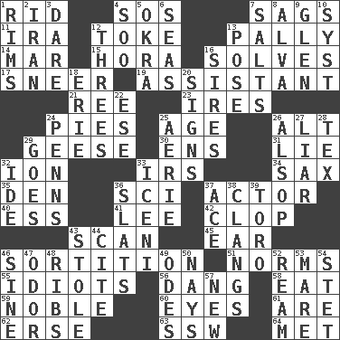 ACROSS 1. To free from 4. Mayday 7. Settles 11. Retirement account (abbr.) 12. Casino tip 13. Friendly 14. Third mo. 15. Israeli folk dance 16. Finds the solution 17. Contemptuous expression 19. Aide 21. To sift 23. Angers 24. Sliced desserts 25. Grow older 26. The first octave above the treble staff 29. Honkers 30. Followers of ems 31. Falsehood 32. Electrically charged atom 33. Big collection agency 34. Saxophone 35. Lair 36. _-fi 37. Thespian 40. Curvy letter 41. Area sheltered from the wind 42. Hoof sound 43. Skim 45. Ewer handle 46. Determination 51. Typical models 55. Foolish or stupid persons 56. Mild oath, euphamism for damn 58. Ingest 59. Impressive in appearance 60. Snake ____ (dice throw) 61. "We ___ not amused" (Victoria) 62. Celtic language 63. Compass dir. 64. Was introduced to DOWN 1. Basketball hoops 2. SW Asia republic 3. Have the gumption 4. "Barney Miller" actor Jack 5. Gumbo ingredient 6. Oceans 7. Table seasonings 8. Inventor's middle name 9. Small, secluded valley 10. System (abbr.) 12. Trios 13. Introduce or present, as a question 16. Titles for men of rank and authority 18. One of the Great Lakes 20. Omens 22. Compass dir. 24. Actor Sean's family 25. Nest on high 26. Columnist Joseph or Stewart 27. One who doesn't tell the truth 28. John Ritter's dad 29. Moves 32. Binary compound 33. Ancient Celtic tribe of eastern Britain 36. Narrow boards 37. Adept person 38. Rings like a ship's bell 39. "Corrida" creature 43. Took without asking 44. Quote 46. Trig term 47. Aroma 48. Chest bones 49. Lyric poems 50. Negative votes 52. 480, 500 or 516 sheets of paper 53. Female horse 54. Proofreading order 57. ___ Haven, CT