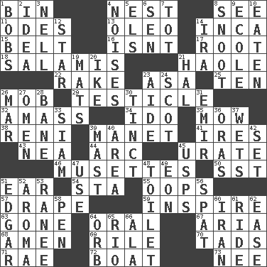 ACROSS 1. Storage container 4. A home for chicks 8. Observe 11. Lyric poems 13. Margarine 14. South American Indian 15. Waist strap 16. Is not 17. Carrot, for example 18. Deli grouping 21. White Person, in Hawaii 22. Immoral or dissolute person 23. White ___ sheet 25. "___ Little Indians" 26. Disorderly crowd 29. One of the two male reproductive glands 32. Collect or gather 34. Wedding promise 35. Cut the grass 38. Painter Guido (1575-1642) 39. French painter Edouard 41. Angers 43. Teachers' org. 44. Curve 45. A salt of uric acid 46. French bagpipes 50. Fast jet (abbr.) 51. Ewer handle 54. R.R. building 55. I made a mistake 57. Window treatment 59. Stimulate to action 63. Went 64. Spoken 67. Operatic vocal solo 68. So be it 69. Cause heat under the collar 70. Small boys 71. Actress Charlotte 72. Water vessel 73. Born DOWN 1. Moves up and down 2. The main thing one is thinking about 3. 1994 drama film starring Jodie Foster 4. Annoying sounds 5. Raised railways 6. Elected rep. 7. Small child 8. Snob 9. Learning spot: Fr. 10. Consumed 12. Play the lead 14. Lyricist Gershwin 19. Floor protectors 20. Mamie's mate 21. Actor Linden 23. Assistant 24. Highlander 26. Make imperfect 27. Sign of something about to happen 28. Object of repulsion 30. Colored lightly or faintly 31. Independent ruler or chieftain 33. Thailand, formerly 36. Mouths or openings 37. Moistens 39. Vertical spar for supporting sails 40. Length times width 42. Put into a specified state 45. United States Postal Service (abbr.) 47. Purpose 48. Bathroom plumbing fixture 49. Period of immesurable duration 51. _ Allan Poe 52. Scent 53. Indian princess (variant) 56. Argument over a trivial matter 58. Writing instrument 60. SW Asia republic 61. Travel on or in a vehicle 62. Comfort 64. Globe 65. _ de Janeiro 66. According to
