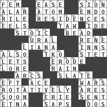 ACROSS 1. Opposite of masc. 4. Relaxation 8. The Jewish people; Israel 12. Having or resembling wings 14. Tiny particle 15. Inside; within (prefix) 16. Cause heat under the collar 17. Dwellings 20. Snakelike fish 21. The 23rd letter of the Hebrew alphabet 22. Binary compound 23. Unemotional 27. Necklace unit 29. Mountain range 31. French philosopher Descartes 34. Climbing, woody, usually tropical vines 35. Restaurants 36. In addition 39. Ring climax 41. Proofreading order 42. Allows 43. Eat (away) 46. Old wives' tales, e.g. 47. Precipitation 48. Arches 51. Schedule 54. Newt 56. Adept person 58. Armed conflicts 61. Producing rotation 66. Ancient Greek god of war 67. Within a short period 68. One of the Great Lakes 69. Posted 70. Inactive volcano in Sicily 71. Plant excrements 72. Two (Sp.) DOWN 1. Conductor's collection 2. Writer Wiesel 3. Shopping centers 4. Hearing organ 5. Had dinner 6. Distress signal 7. Send forth 8. Elected rep. 9. Event 10. Wrote a lyric poem 11. Olfactory organ 13. Remainder 18. Small moist lump or mass 19. She-sheep 24. Fr. "Yes" 25. Lyricist Gershwin 26. Patter 28. Get up 30. Member of a famous L.A. basketball team 32. Compass dir. 33. Eastern Standard Time (abbr.) 34. Failure 36. 100% 37. Lion 38. Ski resort town in Vermont 40. Mouths or openings 44. Petroleum 45. Heredity factor (abbr.) 49. Domesticated feline 50. _-fi 52. It was, poetically 53. Having ears or earlike features 54. Celtic language 55. 12 inches 57. Nights before holidays 59. Western Nevada city 60. Fast planes 62. Santa ___, CA 63. Epoch 64. Mouth edge 65. It is so