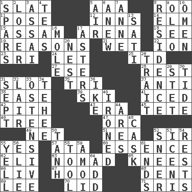 ACROSS 1. Narrow board 5. American Automobile Association (abbr.) 8. Friend of Pooh 11. Introduce or present, as a question 12. Restaurants 14. Shade tree 15. Indian state 17. Sports stadium 18. Observe 19. Thinks logically 21. Soggy 22. Electrically charged atom 23. Indian title of respect (Mr.) 24. Allow 25. It would 27. Compass dir. 28. Respite 31. Narrow opening 35. Three (prefix) 37. Against 38. Comfort 39. What Jean-Claude Killy likes to do 41. On the rocks 42. Heart or essence 43. Period 45. False hair 46. Woody plant 47. The grampus (Milton) 49. Remaining after all deductions 51. Teachers' org. 52. Title for a knight 55. It is so 57. "One Day ___ Time" 60. Core 62. Biblical high priest 63. Wanderer 65. Leg joints 66. 54 in ancient Rome 67. Parka part 68. Undesirable depression on a surface 69. Area sheltered from the wind 70. Flaplike covering 71. Indian titles of respect DOWN 1. Practice fights 2. Failure 3. Slender Brazilian palm 4. Afternoon social gatherings 5. Wind 6. Afresh 7. Queen of England 1702-14 8. Dwelling 9. Margarine 10. Sign of something about to happen 13. Suttee (variant) 16. Undercover agent 17. Michaelmas daisies 20. Egg locale 26. Distinguishing feature 29. Proofreading order 30. Periodic rise and fall of the sea level 31. Back-to-school mo. 32. Den 33. Clearly or manifestly demonstrative 34. Giggle 36. D.D.E's nickname 40. Pressed 44. Ancient Greek god of war 48. Keg 50. Hyperbolic tangent 52. Contemptuous expression 53. Ancient Celtic tribe of eastern Britain 54. Musical pauses 55. Shout 56. Writer Wiesel 58. Instrument 59. Mine, in Marseilles 61. Conclusions 64. Increase