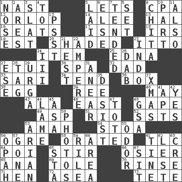 ACROSS 1. Political cartoonist Thomas 5. Allows 9. Numbers guy (abbr.) 12. Lowest deck of a ship 14. Toward shelter 15. Actor Linden 16. Theater features 17. Is not 18. Big collection agency 19. Eastern Standard Time (abbr.) 20. Cast a shadow over 23. "Tell ____ the Marines!" 24. A whole individual unit 25. Pulitzer Prize-winning author Ferber 27. Needle holder 30. Health resort 32. June honoree 33. Indian skirt 34. Look after 36. Gift holder 38. Ovum 39. Portuguese money of account (variant) 40. Fifth month 43. Chicken ___ king 46. Compass direction 48. Stare wonderingly 49. Viper 51. River (Sp.) 52. Fast planes 53. Housemaid 54. Portico 56. Legendary monster 58. Spoke pompously 61. Affectionate concern, for short 64. Luau course 65. Use a swizzle stick 66. Flexible twig of a willow tree 68. Santa ___, CA 69. Lacquered or enameled metalware 70. Remove soap 71. Layer 72. Toward the sea 73. False hair DOWN 1. Sense of smell 2. Ancient Greek god of war 3. Narrow board 4. Small child 5. Put down 6. Otherwise 7. Watched over 8. Put into a specified state 9. Riviera of "Kiss of the Spider Woman" 10. Role in a play 11. In addition 13. Inconspicuous attention getter 21. Command 22. Electrical Unit 23. Southeast Asian peninsula 24. One more than two 26. Small moist lump or mass 27. Compass dir. 28. Label 29. Capital and largest city of Mongolia 31. Approach 35. Cease 37. Dec. holiday 41. Fitting 42. Affirmative reply 44. Unable to walk 45. White ___ sheet 47. Haul 48. Girls' org. (abbr.) 50. Pictures 53. Believer in; advocate of (suffix) 55. Aroma 56. Brightly colored fish 57. Went 59. Cause heat under the collar 60. Type of rug 61. Prong on a fork 62. For fear that 63. Algonquian 65. R.R. building 67. Be seated