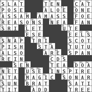 ACROSS 1. Narrow board 5. Nine, plus one 8. Feline 11. Introduce or present, as a question 12. _ vera 14. Single 15. Indian state 17. Collect or gather 18. Enemy 19. Thinks logically 21. Teachers' org. 22. Air blower 23. _ Lanka 24. Allow 25. Shoshoni 27. Compass dir. 28. Snakelike fish 31. Fastener 35. Three (prefix) 37. Native of Scotland 38. Expression of disdain 39. R.R. building 41. Ballerina skirt 42. In addition 43. "We ___ not amused" (Victoria) 45. Connect, as a bridge 46. It's straight from the horse's mouth 47. Music discs 49. Elected rep. 51. Afternoon social gathering 52. ___ good deed 55. Remaining after all deductions 57. Purpose 60. Motivate 62. _ moment's notice (2 wds.) 63. Mysterious quality of enchantment 65. Underwater navigation system 66. Player for Phoenix 67. Naughty child 68. Suttee (variant) 69. Teat (slang) 70. Increase 71. Family _ (genealogy) DOWN 1. Practice fights 2. Failure 3. Slender Brazilian palm 4. Beverages made from leaves 5. Scottish cap 6. Flair 7. Olfactory organ 8. Java holder (2 wds.) 9. Small Philippine buffalo 10. Adolescent 13. Son of Isaac 16. Undercover agent 17. Michaelmas daisies 20. A home for chicks 26. Trials 29. Globular water bottle used in Asia 30. Surprise greatly 31. Practice fight 32. The longest river in the world 33. Aide 34. Give a jingle 36. Call ___ day 40. Northern region 44. Locale of original sin 48. Backtalk 50. Unfeeling 52. Middle Eastern gold or silver currency 53. Speak pompously 54. Nest on high 55. Political cartoonist Thomas 56. Needle case 58. "Two Mules for Sister ____" 59. Mild oath 61. Mail 64. It would