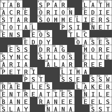 ACROSS 1. Bar bill 4. Coast Guard woman 8. Thin strip of wood or metal 12. 1/640 square mile 14. Constellation of myth 16. Singer Brickell 17. Play the lead 18. Wine waiters 20. "_____ Recall" 22. 23rd letter of the Greek alphabet 23. Remaining after all deductions 24. Followers of ems 25. Greek goddess of the dawn 28. Affectionate concern, for short 30. Whirlpool 31. Fertile tracts in a desert 35. Double-curved letter 37. To be drawn or hauled along 40. Greater amount 41. Synchronize (abbr.) 42. Grain storage towers 44. Writer Wiesel 45. Operatic vocal solo 46. Having or resembling wings 47. Portuguese money of account (variant) 48. _ dish (used to culture cells) 50. Pale green bean 52. Pacific Standard Time (abbr.) 54. Compass dir. 55. Compass dir. 58. Actress Charlotte 61. French article 63. Member of a famous L.A. basketball team 65. Pleas 70. The longest river in the world 71. Object of repulsion 72. The wife of a rajah (variant) 73. Snakelike fish 74. Kill 75. Grandmother 76. Fast jet (abbr.) DOWN 1. Clothes sense 2. 13-14th century defensive garment 3. Naughty children 4. Mayday 5. Adept person 6. Direct toward a target or goal 7. Frolic 8. Luau accessory 9. An important port of Yemen 10. Hoop that covers a wheel 11. Command 13. Period 15. A home for chicks 19. _ and Stitch 21. Directed 26. Likelihood 27. Damascus' land 29. Device for capturing images 30. Fortification 32. Flatfish 33. One of the Great Lakes 34. Perceive with the eye 35. Jane of fiction 36. In a ____ (agitated or irritated) 38. Everything 39. Purposes of endeavors 41. Plant excrement 43. Indian titles of respect 49. Small island 51. Cartoonist voice _ Blanc 53. Lacerate 55. Atmospheres 56. Makes a sale 57. Take or capture by force 58. Confederate soldiers (slang) 59. Of or related to the anus 60. Inactive volcano in Sicily 62. Comedian Laurel of Laurel & Hardy 64. One (Scot) 66. Marina Del _, California 67. _ tizzy (2 wds.) 68. Car or cant ending 69. Ocean