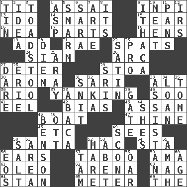 ACROSS 1. Teat (slang) 4. Slender Brazilian palm 9. Body of Kaffir warriors 13. Wedding promise 14. Don Adams' spy role 15. Rend 16. Teachers' org. 17. Components 18. Coop moms 19. Increase 21. Actress Charlotte 22. Arguments over trivial matters 24. Thailand, formerly 26. Curve 27. Prevent from occurring 29. Portico 30. Scent 31. Indian skirt 33. The first octave above the treble staff 36. River (Sp.) 37. Pulling on something suddenly 40. "Barney Miller" actor Jack 41. Snakelike fish 42. Prejudice 43. Indian state 45. Water vessel 47. One or ones belonging to thee 48. And so on (abbr.) 49. Observes 50. Before Barbara or Clara 52. Big _ 54. R.R. building 56. Hearing organs 57. Off limits 59. Nanny (var.) 61. Butter sub 62. Sports stadium 63. Tired old horse 64. Comedian Laurel of Laurel & Hardy 65. Distance measurement 66. Definite Article DOWN 1. Metal container 2. The content of cognition 3. Inedible or poisonous agaric 4. Cleo's killer 5. Excessive but superficial compliments 6. "Two Mules for Sister ____" 7. Johnson of "Laugh-In" 8. ___ a Wonderful Life 9. New York city 10. Rendezvous 11. Baking dishes 12. Big collection agency 20. South Vietnam president (1954) 22. Smooth fabric 23. Adept person 25. Like ___ of sunshine 27. Have the gumption 28. One of the Great Lakes 29. Indian titles of respect 31. In a ____ (agitated or irritated) 32. Alias (abbr.) 33. Helper 34. Grant temporary use of 35. Heavy book 38. Phillipine bananalike plant 39. Yard entry 44. "______ My Girl" (Turtles hit) 45. Gillaume's butler role 46. Baseball player Mel 49. Biscuitlike quick bread 50. Table seasoning 51. Length times width 52. Female horse 53. Collude with 55. Wet nurse 56. Greek goddess of the dawn 57. Scottish cap 58. Rowing implement 60. Ripen