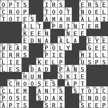 ACROSS 1. Elects 5. Big collection agency 8. Celtic language 12. Riding implement 13. A blast of a horn 15. Christmas carol 16. Hauls 18. Nanny 19. Mountain range southwest of Kyrgyzstan 20. Keyboard modifier key 22. Hard copy producer 24. Peachy ____! 26. Born 27. Pulitzer Prize-winning author Ferber 28. In the manner of 29. Sight organ 32. Put on (as clothing) 35. Many (prefix) 37. Turn to the right 38. Blunders 39. Sliced dessert 40. Place where flour is made 41. Untruth 42. Seaweed 43. United States Postal Service (abbr.) 44. French article 45. Male parent 46. Baking dishes 49. Attila the _ 50. Migrant worker of the '30s 51. Opts 55. Fitting 56. Clement's nick name 57. Pismires 59. Unemotional 63. Introduce or present, as a question 64. Neighbor of Neb. 65. Inside; within (prefix) 66. Flats, for short 67. Indian title of respect (Mr.) 68. Ooze DOWN 1. Sep. follower 2. Adept person 3. Small child 4. Orators 5. Call ___ day 6. Frolic 7. Fly high 8. Related on the mother's side 9. Hero or heavy, e.g. 10. Dry up 11. Biblical high priest 14. Without force or sincere effort 17. Downhill vehicle 21. "___ Little Indians" 23. Teachers' org. 25. Slept 28. City in Syria 29. Armor plate that protects the chest 30. Sharp bark 31. Snakelike fish 32. Water source 33. 4th largest of the Great Lakes 34. Ancient Greek god of war 36. Lubricate 40. French bagpipes 42. Sunflower state 45. Superhero pair 47. Alias (abbr.) 48. Cuts off 49. Residences 51. Hoof sound 52. Command 53. Extremities 54. Play the lead 56. Numbers guy (abbr.) 58. What Jean-Claude Killy likes to do 60. Single 61. Binary compound 62. Police officer (slang)