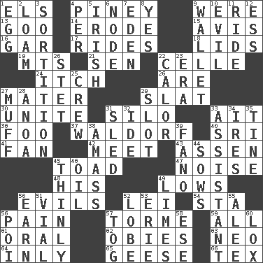 ACROSS 1. Raised railways 4. Abounding in pines 9. Past tense of be (plural) 13. Thick or sticky substance 14. Eat (away) 15. Opinion 16. Slender fish 17. Amusement-park features 18. Hats (slang) 19. Mountains (abbr.) 21. Elected rep. 22. Cell (Danish) 24. Hankering 26. "We ___ not amused" (Victoria) 27. Mother 29. Narrow board 30. Join together 31. Grain storage tower 33. Small island 36. Egg _ yung 37. Apple salad 40. Indian title of respect (Mr.) 41. Avid follower 42. Confront 43. NE Netherlands city 45. Frog relative 47. Annoying sound 48. Part of HMS, perhaps 49. Moos 50. Vices 52. Luau accessory 54. R.R. building 56. Ache 57. Singer Mel 59. Everything 61. Relating to the mouth 62. Off-Broadway awards 63. Modern: prefix 64. Inwardly 65. Honkers 66. John Ritter's dad DOWN 1. Oval reproductive body of a fowl 2. Rich soil 3. Decision 4. For each 5. From or relating to Ireland 6. Thickened enlargement 7. Locale of original sin 8. It is so 9. Place for singles 10. Morally bad or wrong 11. Travel on an animal 12. Curvy letter 20. Proofreading order 22. Bodily heat indicating an inflammation 23. Period 25. Ship's personnel 27. Bungle 28. Small Philippine buffalo 29. Notch 31. Downhill vehicle 32. Binary compound 33. Helper 34. Angers 35. Prong on a fork 38. Collect or gather 39. Papal veil 44. Sty mamas 45. Without force or sincere effort 46. Lubricate 49. Citrus fruits 50. Merit 51. Small bottle 52. Ear part 53. One of the Great Lakes 55. Toward shelter 56. Luau course 57. Coat; cloak 58. Compass dir. 60. Brine-cured salmon