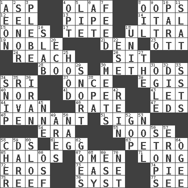 ACROSS 1. Viper 4. Norwegian king 8. I made a mistake 12. Snakelike fish 13. Corncob 14. Slanted text style (abbr.) 15. Singles 17. False hair 18. Extreme 19. Impressive in appearance 21. Lair 23. Baseball player Mel 24. Arrive at 26. Be seated 28. Scornful sounds 30. Modes 34. _ Lanka 37. At one time in the past 39. Armor plate that protects the chest 40. Not either 41. Drug addict 43. Allow 44. "Terrible" tsar 46. Assign a rank or rating to 47. Begley and Asner 48. Pre-World Series prize 51. Omen 54. Period 55. Trap for birds or small mammals 58. Music discs 61. Ovum 63. Stone: prefix 65. Radiant circles of light 67. Presage 71. Yearn 72. Greek god of love 73. Relaxation 74. Sliced dessert 75. Coral collection 76. System (abbr.) 77. Perceive with the eye DOWN 1. Period of immesurable duration 2. Sir (Sp.) 3. Military trainee 4. Elect 5. Untruth 6. Fitting 7. Nourish 8. Lubricate 9. "Beetle Bailey" pooch 10. Piece 11. Narrow board 16. Broad, flat, thick piece 18. A single undivided whole 20. Environmental prefix 22. Compass dir. 25. Parka part 27. Definite Article 29. Derisive sound 30. Confronts 31. Stare 32. Passed on 33. Fast planes 34. Sever or remove by pinching or nipping 35. Be footloose 36. SW Asia republic 38. Accounting whiz (abbr.) 42. It's straight from the horse's mouth 45. Compass dir. 49. Ancient Greek god of war 50. Tired old horse 52. Republican Party 53. Christmas carol 56. Obstructs or blocks passage 57. Bert's buddy 58. "Mermaids" star 59. Have the gumption 60. A type of plum 62. Travels 64. Double curve, resembling the letter S 66. Order of Saint Francis (abbr.) 68. Can I? 69. Double-curved letter 70. Remaining after all deductions