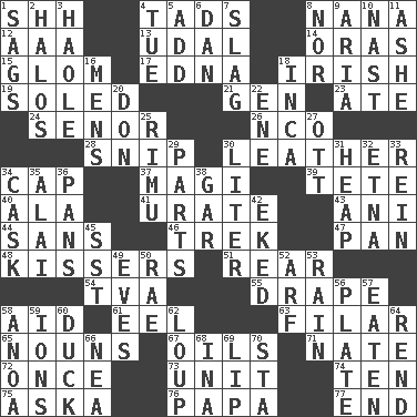 ACROSS 1. Quiet! 4. Small boys 8. Nanny 12. American Automobile Association (abbr.) 13. Allodial 14. Mouths or openings 15. Seize upon or latch onto something 17. Pulitzer Prize-winning author Ferber 18. From or relating to Ireland 19. Having a sole or soles 21. Commissioned military rank (abbr.) 23. Had dinner 24. Sir (Sp.) 26. Non-commissioned officer (abbr.) 28. Clip 30. Cordwainer's material 34. Head covering 37. Wise men 39. Wig 40. Insect wing 41. A salt of uric acid 43. Black tropical American cuckoo 44. Without 46. Long journey 47. Baking dish 48. Smoochers 51. Bring up, as a child 54. Federal power corp. 55. Window treatment 58. Assist 61. Snakelike fish 63. Of or pertaining to a thread or threads 65. Parts of speech 67. Lubricates 71. Nathan's nickname 72. At one time in the past 73. A single undivided whole 74. "___ Little Indians" 75. "____ silly question..." 76. Dad 77. Conclude DOWN 1. Sinks 2. Rings 3. White Person, in Hawaii 4. Third day of the wk. 5. Find the sum of 6. Daniel's nick name 7. Volcanic refuse 8. Not either 9. Roberta Peters solo 10. Political cartoonist Thomas 11. American tennis player Robert 16. Not women's 18. South American Indian 20. Spanish title 22. Compass dir. 25. Tall New Zealand timber tree 27. Baseball player Mel 29. Actors' quests 30. 61 cubic inches 31. Pile 32. Inactive volcano in Sicily 33. It's straight from the horse's mouth 34. Keg 35. Jai _ 36. Baking dishes 38. Slender fish 42. Made supply last 45. Fast jet (abbr.) 49. Nights before holidays 50. Actress Charlotte 52. Sandy's bark 53. Precipitation 56. Food holder 57. Ingested 58. Small Philippine buffalo 59. Charged particles 60. Evade 62. Central Nebraska county 64. Tear apart 66. Teachers' org. 68. _ tizzy (2 wds.) 69. Mouth edge 70. R.R. building