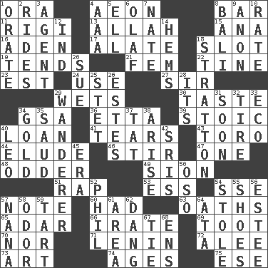 ACROSS 1. Mouth or opening 4. A really long time 8. Drinking establishment 11. Swiss mountan, "Queen of the Mountains" 13. Assad's deity 15. Santa ___, CA 16. An important port of Yemen 17. Having winglike extensions 18. Groove 19. Is inclined (to) 21. Opposite of masc. 22. Prong on a fork 23. Eastern Standard Time (abbr.) 24. Purpose 27. Title for a knight 29. Soaks 30. Clothes sense 34. Girls' org. (abbr.) 36. Singer James 39. Unemotional 40. Grant temporary use of 41. Pulls apart 43. "Corrida" creature 44. Dodge 46. Use a spoon 47. Single 48. More peculiar 49. The Jewish people; Israel 51. Strike 53. Curvy letter 54. Compass dir. 57. Brief written record 60. Possessed 63. Expletives 65. The sixth month of the Jewish calendar 66. Feeling or showing extreme anger 69. A blast of a horn 70. And not 71. Soviet premier 1918-24 72. Toward shelter 73. Nonscientific branch of learning 74. Eras 75. Compass dir. DOWN 1. Declaim 2. Amusement-park features 3. Rep 4. American Automobile Association (abbr.) 5. Pipe bend 6. Norwegian king 7. Nathan's nickname 8. Indonesian resort city 9. Soon (poet.) 10. Assign a rank or rating to 12. Working for oneself (abbr.) 14. Folds over and sews together 18. Ski resort town in Vermont 20. Take to court 25. Proofreading order 26. _____ Park, CO 28. It is 29. Nomad 31. Within a short period 32. Become fatigued 33. Environmental prefix 34. Gilded 35. Saudi Arabian king (1953-1964) 37. Make lace 38. Get up 40. Lion 42. Indian titles of respect 45. Period 50. Bear (Spanish) 52. Silvers or Donahue 54. Fur scarf 55. Imelda's hoard 56. First name in cosmetics 57. Grandmother 58. Aroma 59. Small pie 61. Length times width 62. Mild oath, euphamism for damn 64. "One Day ___ Time" 67. Neckwear 68. Followers of ems
