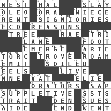 ACROSS 1. 270 degrees 5. Actor Linden 8. Kill 12. Butter sub 13. Mouth or opening 14. Sibling's daughter 15. Monthly bill 16. Seigniories (variant) 19. Environmental prefix 20. Thinks logically 21. Family _ (genealogy) 23. Actress Charlotte 24. Three (prefix) 27. Unable to walk 30. Lowest support of a structure 31. Develop 34. Johnson of "Laugh-In" 35. Torque (variant) 38. Collection of objects 40. Wander aimlessly 41. Send forth 42. Dirtied 44. Snakelike fish 45. Moving, as bait 46. Compass dir. 47. Large container 50. Writer Wiesel 53. Speakers 57. Plant excrement 59. Supplying deficiencies 63. Fast planes 64. Distinguishing feature 65. Lair 66. Institutes legal proceedings 67. Helper 68. Conclude 69. Left DOWN 1. Had on 2. Voters do this 3. Sir (Sp.) 4. Small child 5. Flexible conduit 6. Operatic vocal solo 7. Straggles 8. Title for a knight 9. Flowery wreath 10. Adept person 11. Affirmative reply 14. Sense of smell 17. Not either 18. _ tizzy (2 wds.) 20. 480, 500 or 516 sheets of paper 22. Chooses 24. "Corrida" creature 25. Round or rotation of duties 26. A whole individual unit 28. Was introduced to 29. Blunders 30. Bundle 32. Thick or sticky substance 33. Morally bad or wrong 35. Adolescent 36. Sign of things to come 37. Cause heat under the collar 39. Connecticut Ivy Leaguer 43. Nights before holidays 47. Electrical Unit 48. "We ___ not amused" (Victoria) 49. Make lace 51. Come out of 52. Ingested 54. Event that recurs at intervals 55. Baking chamber 56. Tear apart 58. Inconspicuous attention getter 59. R.R. building 60. RI univ. 61. Writing tablet 62. Sliced dessert 63. Compass dir.