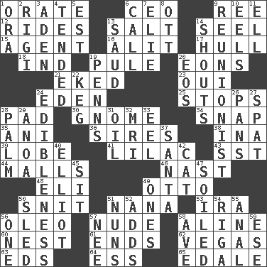 ACROSS 1. Declaim 6. Corporate head (abbr.) 9. To sift 12. Amusement-park features 13. Table seasoning 14. Sew up the eyelids of hawks and falcons 15. Representative 16. Came down and settled, as after flight 17. Frame or body of a ship 18. Working for oneself (abbr.) 19. Whimper 20. Immeasurably long periods of time 21. Made supply last 23. Fr. "Yes" 24. Paradise 25. Ceases 28. Writing tablet 30. Dwarf 34. Fastener 35. Cuckoo 36. Fathers 38. _ tizzy (2 wds.) 39. Ear part 41. Pale purple color 43. Fast jet (abbr.) 44. Shopping centers 46. Political cartoonist Thomas 48. Biblical high priest 49. Von Bismarck 50. In a ____ (agitated or irritated) 51. Grandmother 53. Retirement account (abbr.) 56. Margarine 57. Naked 58. Place in a line 60. Egg locale 61. Conclusions 62. Viva Las _ 63. Begley and Asner 64. Double-curved letter 65. Peak District village in England DOWN 1. Mouth or opening 2. Swiss mountan, "Queen of the Mountains" 3. Arabian gulf 4. Watched over 5. Eastern Standard Time (abbr.) 6. Give a ring to 7. Writer Wiesel 8. Baseball player Mel 9. One who advocates reunion 10. Snakelike fish 11. Pipe bend 13. Saudi Arabian king (1953-1964) 14. Yells 19. Actor Sean's family 20. Greek goddess of the dawn 22. Barrel 24. The property of being fit to eat 26. Baking dishes 27. Petty quarrel 28. Inside of hand 29. Small Philippine buffalo 31. Lubricate 32. Medical imaging device (abbr.) 33. Snakelike fish 37. Before Barbara or Clara 40. American author Paul (1891-1958) 42. Feline 45. Be seated 47. Dirtied 49. Singles 50. Downhill vehicle 51. Religious women 52. Does sums 54. Port city in Latvia 55. Of or related to the anus 56. Single 57. Born 58. "___ Maria" 59. Compass dir.
