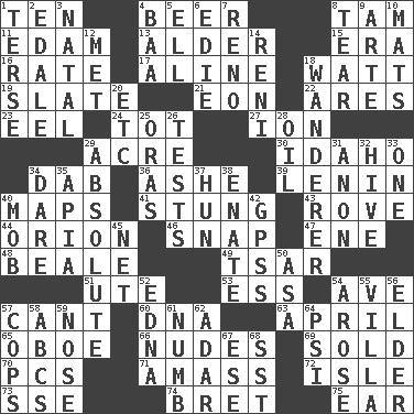 ACROSS 1. "___ Little Indians" 4. Fermented drink made from hops 8. Scottish cap 11. Dutch treat 13. Tree or shrub in the Birch family 15. Epoch 16. Assign a rank or rating to 17. Place in a line 18. Electrical Unit 19. Chalkboard 21. Period of immesurable duration 22. Ancient Greek god of war 23. Snakelike fish 24. Small child 27. Electrically charged atom 29. 1/640 square mile 30. Potato state 34. Pat or tap gently 36. American tennis player Robert 39. Soviet premier 1918-24 40. Atlas contents 41. Feeling sharp psychological pain 43. Be footloose 44. Constellation of myth 46. Fastener 47. Compass dir. 48. Calif. Air Force Base 49. Russian ruler of old 51. Shoshoni 53. Curvy letter 54. "___ Maria" 57. Patter 60. Heredity factor (abbr.) 63. Showery time 65. Mitch Miller's instrument 66. Unadorned figures 69. Disposed of to a purchaser 70. Personal Computers (abbr.) 71. Collect or gather 72. Small island 73. Compass dir. 74. Cy Young winner Saberhagen 75. Hearing organ DOWN 1. Laconic 2. Peak District village in England 3. Brizilian seaport 4. Sound made by sheep 5. Pipe bend 6. Singer Brickell 7. Former U.S. Attorney General Janet 8. Pull into pieces 9. Johnson of "Laugh-In" 10. Floor protectors 12. Was introduced to 14. Painter Guido (1575-1642) 18. Roamer 20. And so on (abbr.) 25. Mouths or openings 26. Trials 28. Lubricate 29. Utter; complete 31. At once, immediately (arch.) 32. Hub of activity 33. Single 34. Have the gumption 35. Capital of Western Samoa 37. Attila the _ 38. Maternal 40. Disorderly crowd 42. Global Positioning Systems (abbr.) 45. Fish or hair follower 50. White ___ sheet 52. Pulitzer Prize-winning author Ferber 54. Came up 55. Country residence 56. A person who is older than you are 57. 911 reaches them 58. Lettered men learn these first 59. Characteristic smell of wine 61. Unfeeling 62. The sixth month of the Jewish calendar 64. Air pressure measure (abbr.) 67. Compass dir. 68. Fast jet (abbr.)