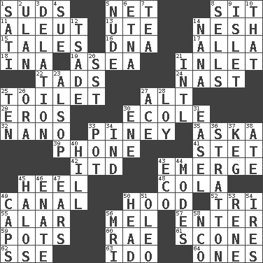 ACROSS 1. Beer foam 5. Fish or hair follower 8. Be seated 11. Native American of Southwest Alaska 13. Shoshoni 14. Soft 15. Falsehoods 16. Heredity factor (abbr.) 17. Silent film actress Nazimova 18. _ tizzy (2 wds.) 19. At sea 21. An arm off of a larger body of water 22. Bits 24. Political cartoonist Thomas 25. Bathroom 27. Keyboard modifier key 29. Greek god of love 30. Learning spot: Fr. 32. Billionth: prefix 33. Abounding in pines 35. "____ silly question..." 39. Give a jingle 41. Proofreading order 42. It would 43. Develop 45. The bottom of a shoe or boot 48. Root beer relative 49. Lessep's creation 50. Parka part 52. Three (prefix) 55. Having or resembling wings 56. Cartoonist voice _ Blanc 57. Keyboard key 59. Plant holders 60. Actress Charlotte 61. Biscuitlike quick bread 62. Compass dir. 63. Wedding promise 64. Singles DOWN 1. Suttee (variant) 2. Uhlan (variant) 3. Accusation by an informer 4. Take to court 5. Naked 6. Inactive volcano in Sicily 7. Afternoon social gathering 8. Exchanges for money 9. Small island 10. Not this but _ 12. Sadhe (variant) 14. Grandmother 20. Fast jet (abbr.) 21. International (abbr.) 23. Columnist Joseph or Stewart 25. "___ Little Indians" 26. Mouth or opening 27. Adept person 28. Myrna of the movies 30. Compass dir. 31. Artist's stand 33. Cooking vessel 34. Working for oneself (abbr.) 36. Ski resort town in Vermont 37. Barrel 38. Had dinner 40. Land elevation 43. Environmental prefix 44. Methods 45. Radiant circles of light 46. Related on the mother's side 47. Hearing organs 49. Smile enhancers 50. Froth on beer 51. Butter sub 53. French philosopher Descartes 54. Angers 56. Medical imaging device (abbr.) 58. Non-commissioned officer (abbr.)