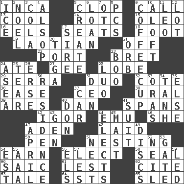 ACROSS 1. South American Indian 5. Hoof sound 9. Give a ring to 13. Calm and collected 14. College mil. group 15. Butter sub 16. Snakelike fish 17. Theater features 18. One third of a yard 19. Of or relating to Laos or its people 21. No longer planned or scheduled 22. Left side of a ship or aircraft 23. Cy Young winner Saberhagen 24. Had dinner 27. Unit of force equal to gravity 28. Ear part 29. Father Junipero _ 31. Superhero pair 32. ____ d'Azur (French Riviera) 36. Relaxation 37. Corporate head (abbr.) 38. Mountain range 39. Ancient Greek god of war 40. Daniel's nick name 41. Connects, as a bridge 42. Russian composer Stravinsky 44. Australian flightless bird 46. A female animal or person 47. An important port of Yemen 48. Put down 50. Animal enclosure 51. Snuggling 54. Merit 56. Opt 58. Lick closed 60. Ketch in the Levant 61. For fear that 62. Quote 63. Lie 64. Fast planes 65. Downhill vehicle DOWN 1. Frozen water 2. Christmas carol 3. Root beer relative 4. Columnist Joseph or Stewart 5. Make 6. Grant temporary use of 7. Baseball player Mel 8. Personal Computers (abbr.) 9. Java holder (2 wds.) 10. At or to great height 11. Lion 12. Car dealer's back yard 17. The founder of a family 20. Ancient Roman robe 21. Globe 23. Surprise greeting 24. Toward the sea 25. Lacerate 26. Celtic language 28. Nilotic language 30. Home 31. Lair 33. Mouths or openings 34. Hyperbolic tangent 35. Otherwise 37. 4-wheeled motor vehicle 40. Spanish title 41. Set or collection 43. Commissioned mil. rank 44. Opts 45. Vertical spar for supporting sails 47. Showery time 49. Plates 51. Egg locale 52. Famous astronaut Armstrong 53. Yard entry 54. Eastern Standard Time (abbr.) 55. Auto club (abbr.) 56. Raised railways 57. French article 59. Directed