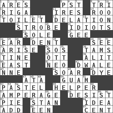 ACROSS 1. Ancient Greek god of war 5. Pacific Standard Time (abbr.) 8. Three (prefix) 11. Capital of Latvia 12. Angers 13. Friend of Pooh 14. Bathroom 17. Accusation by an informer 19. Disco prop 21. Foolish or stupid persons 22. Not divided or shared with others 23. Unit of force equal to gravity 24. Ewer handle 27. Undesirable depression on a surface 29. Perceive with the eye 32. Ascend 34. Distress signal 36. Scottish caps 37. Prong on a fork 38. Baseball player Mel 39. Came down and settled, as after flight 40. 90 degrees 41. Modern: prefix 42. A sleeping potion; an opiate (poet.) 43. Compass dir. 44. Fly high 46. Color 47. _ moment's notice (2 wds.) 50. Island territory of the United States 52. Soft color 55. Aide 57. Electrical Measurement 59. Stop 62. Sliced dessert 63. Comedian Laurel of Laurel & Hardy 64. The main thing one is thinking about 65. Find the sum of 66. Car or cant ending 67. Penny DOWN 1. Nonscientific branch of learning 2. River (Sp.) 3. The front part of a cuirass 4. Table seasonings 5. Before (prefix) 6. Major League Baseball Commissioner Bud 7. Sadhe (variant) 8. Musical group of three 9. Carrot, for example 10. Charged particles 12. Binary compound 15. Wear away 16. Lacquered or enameled metalware 18. Standoff 20. Gillaume's butler role 24. Eroded 25. Believer in; advocate of (suffix) 26. Wash lightly 28. Hauls 29. First course 30. Poet Dickinson 31. First name in cosmetics 33. Arrange properly for use 35. Moe Howard, for one 36. The 23rd letter of the Hebrew alphabet 42. Window treatment 45. Old (Scot.) 47. Had dinner 48. Laconic 49. Having winglike extensions 51. Mesonic 52. Dad 53. Among 54. Drove too fast 55. Layer 56. Travel on or in a vehicle 58. Separate the seeds from cotton 60. Elected rep. 61. Make lace