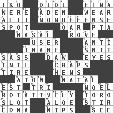 ACROSS 1. Ring climax 4. "You Light Up My Life" star Conn 8. Inactive volcano in Sicily 12. We are 14. Arabian gulf 15. Erode 16. Set down 17. Unrelated to defense, as in spending 20. Blemish 21. Rowing implement 22. Parent Teacher Association (abbr.) 23. Rhinal 27. Be footloose 29. One who makes use of a thing 31. Opposed to 34. Silly 35. In a ____ (agitated or irritated) 36. Backtalk 39. Fool 41. Snake ____ (dice throw) 42. International (abbr.) 43. Dice game 46. Become fatigued 47. Coop moms 48. Tiny particle 51. Brizilian seaport 54. Eastern Standard Time (abbr.) 56. Three (prefix) 58. Christmas carol 61. Happening in regular succession 66. "Corrida" creature 67. Narrow, elongated depression 68. Medicinal plant 69. Move through with a circular motion 70. Pulitzer Prize-winning author Ferber 71. Pinches, bites 72. Observe DOWN 1. It was, poetically 2. Seaweed 3. Greek mythologigal hunter 4. One of the 12 tribes of Israel 5. Wedding promise 6. Lair 7. _ china 8. She-sheep 9. 3-inch nail 10. Political cartoonist Thomas 11. Type of rug 13. Singer James 18. Ewer handle 19. Away 24. Player for Phoenix 25. White ___ sheet 26. Grant temporary use of 28. Flower holders 30. Arrive at 32. Neckwear 33. ___ a Wonderful Life 34. Small island 36. Be seated 37. Black tropical American cuckoo 38. Ski resort town in Vermont 40. Songbird 44. Santa ___, CA 45. Pacific Standard Time (abbr.) 49. Baseball player Mel 50. Medical imaging device (abbr.) 52. Pismires 53. Plunders 54. Celtic language 55. Exchanged or delivered for money 57. _ the terrible 59. 4th largest of the Great Lakes 60. Old wives' tales, e.g. 62. "One Day ___ Time" 63. Biblical high priest 64. Chop off 65. Affirmative reply