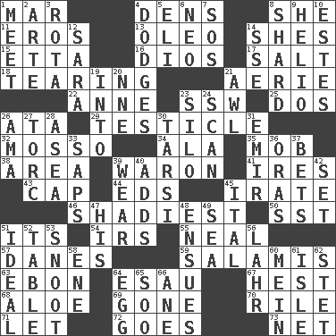 ACROSS 1. Spoil 4. Habitations of wild animals 8. A female animal or person 11. Greek god of love 13. Margarine 14. "______ My Girl" (Turtles hit) 15. Singer James 16. "Vaya con ____" 17. Table seasoning 18. Pulling into pieces 21. Nest on high 22. Singer Murray 23. Compass dir. 25. Two (Sp.) 26. "One Day ___ Time" 29. A testis 32. With motion or animation 34. In the manner of 35. Disorderly crowd 38. Type of rug 39. Make _____ (do battle with) 41. Angers 43. Head covering 44. Begley and Asner 45. Feeling or showing extreme anger 46. Most questionable 50. Fast jet (abbr.) 51. It is 54. Big collection agency 55. Anneal 57. Natives or inhabitants of Denmark 59. Deli grouping 63. Inky black, to poets 64. He sold his birthright 67. Behest 68. _ vera 69. Went 70. Cause heat under the collar 71. Allow 72. Travels 73. Fish or hair follower DOWN 1. Rendezvous 2. Johnson of "Laugh-In" 3. Round or rotation of duties 4. Evades 5. Connecticut Ivy Leaguer 6. Modern: prefix 7. Distress signal 8. Pottery fragment 9. Sun: prefix 10. _____ Park, CO 12. "Two Mules for Sister ____" 14. Compass dir. 19. To the inside or interior of 20. Compass dir. 21. Leather borer 23. Grain storage tower 24. Skim 26. Wet nurse (var.) 27. Torque (variant) 28. At sea 30. Tarsus (plural) 31. Independent ruler or chieftain 33. Plant excrements 36. Mouths or openings 37. Wagers 39. Erode 40. Does sums 42. Put into a specified state 45. Slanted text style (abbr.) 47. Part of HMS, perhaps 48. Takes place subsequently 49. Ocean 51. Perfect 52. Eating place 53. Snout, nose 56. Cowardly lion portrayer 58. Compass dir. 60. Count _ (2 wds.) 61. Small island 62. Proofreading order 64. Ovum 65. "Barney Miller" actor Jack 66. One (Scot)