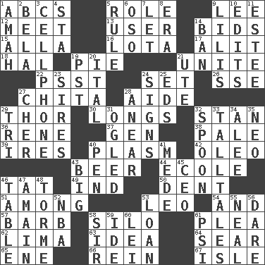 ACROSS 1. Lettered men learn these first 5. Hero or heavy, e.g. 9. Area sheltered from the wind 12. Rendezvous 13. One who uses or employs something 14. Auction offers 15. Silent film actress Nazimova 16. Globular water bottle used in Asia 17. Set down 18. Actor Linden 19. Sliced dessert 21. Join together 22. Inconspicuous attention getter 24. Arrange properly for use 26. Compass dir. 27. Riviera of "Kiss of the Spider Woman" 28. Assistant 29. Son of Odin 30. Yearns 32. Comedian Laurel of Laurel & Hardy 36. French philosopher Descartes 37. Commissioned mil. rank 38. Light colored 39. Angers 40. Suffix with ecto or cyto 42. Margarine 43. Fermented drink made from hops 44. Learning spot: Fr. 46. Make lace 49. Working for oneself (abbr.) 50. Gouge 51. Amid 53. Lion 54. Added to 57. Sharp remark 58. Grain storage tower 61. Entreaty 62. Pale green bean 63. The content of cognition 64. Shrivel 65. Compass dir. 66. It's straight from the horse's mouth 67. Small island DOWN 1. Wet nurse 2. Actor Lugosi 3. Portable communications device 4. R.R. building 5. Governing power 6. Bear (Spanish) 7. Allow 8. Epoch 9. Ms. Damita and namesakes 10. Prepares for publication 11. First name in cosmetics 14. Prohibit 19. Pacific Standard Time (abbr.) 20. Slanted text style (abbr.) 21. Shoshoni 23. Fathers 24. Omens 25. Begley and Asner 27. "Mermaids" star 28. Approach 29. Three (prefix) 31. Stared 32. Soup utensil 33. Baron Munchausen's specialties 34. Toward shelter 35. Modern: prefix 40. Writing instrument 41. Ancient Persian 43. Large 45. Corporate head (abbr.) 46. Eating place 47. With great haste 48. Singer Mel 52. Basketball assoc. 53. Grant temporary use of 55. Actress Patricia 56. Have the gumption 58. Title for a knight 59. Binary compound 60. Luau accessory 61. 23rd letter of the Greek alphabet