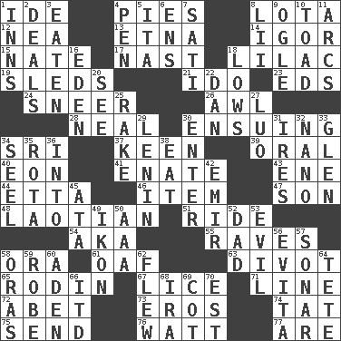 ACROSS 1. Binary compound 4. Sliced desserts 8. Globular water bottle used in Asia 12. Teachers' org. 13. Inactive volcano in Sicily 14. Russian composer Stravinsky 15. Nathan's nickname 17. Political cartoonist Thomas 18. Pale purple color 19. Bobsleighs 21. Wedding promise 23. Begley and Asner 24. Contemptuous expression 26. Leather borer 28. Be tempered by heat 30. Following as a consequence or result 34. _ Lanka 37. Peachy ____! 39. Taken by mouth 40. Period of immesurable duration 41. Maternal 43. Compass dir. 44. Singer James 46. A distinct part 47. Male child 48. Of or relating to Laos or its people 51. Travel on or in a vehicle 54. Alias (abbr.) 55. All-night dance parties 58. Mouth or opening 61. Clumsy lout 63. A piece of turf (Scot.) 65. "The Thinker" sculptor 67. Louse (plural) 71. Actor's bit 72. Collude with 73. Greek god of love 74. Make lace 75. Post 76. Electrical Unit 77. "We ___ not amused" (Victoria) DOWN 1. Restaurants 2. Allots cards 3. Ingested 4. Animal enclosure 5. Call ___ day 6. Followers of ems 7. Suttee (variant) 8. Cards in a Roman deck? 9. Stare 10. Frog relative 11. Curves 16. Locale of original sin 18. Coldest temperatures 20. Observe 22. One of the 12 tribes of Israel 25. Immoral or dissolute person 27. Nilotic language 29. Soviet premier 1918-24 30. Keyboard key 31. Angers 32. Billionth: prefix 33. Small, secluded valley 34. Stitch closed the eyes of (a falcon) 35. Round or rotation of duties 36. To the inside or interior of 38. Erode 42. Arab leader 45. _ moment's notice (2 wds.) 49. Visual representation of an object 50. American Automobile Association (abbr.) 52. Male parent 53. Morally bad or wrong 56. Webber/Rice musical 57. Echolocation 58. Mouths or openings 59. Loose flowing garment 60. Arabian gulf 62. Soared 64. False hair 66. It would 68. Retirement account (abbr.) 69. Small bed 70. Eastern Standard Time (abbr.)