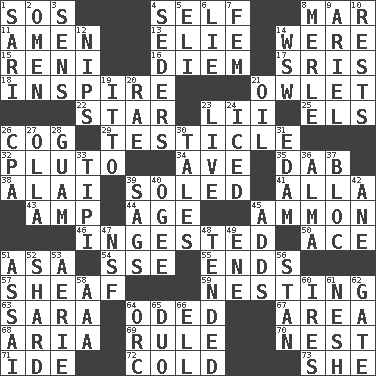 ACROSS 1. Distress signal 4. Automatically 8. Impair 11. So be it 13. Writer Wiesel 14. Past tense of be (plural) 15. Painter Guido (1575-1642) 16. South Vietnam president (1954) 17. Indian titles of respect 18. Motivate 21. A small or young owl 22. Play the lead 23. Cards in a Roman deck? 25. Raised railways 26. Gear tooth 29. One of the two male reproductive glands 32. Cartoon dog 34. "___ Maria" 35. Small moist lump or mass 38. Mountain range southwest of Kyrgyzstan 39. Having a sole or soles 41. Silent film actress Nazimova 43. Electrical Unit 44. Ripen 45. ID or VA city 46. Consumed 50. Adept person 51. White ___ sheet 54. Compass dir. 55. Extremities 57. To gather and bind into a bundle 59. Nestling 63. "Two Mules for Sister ____" 64. Wrote a lyric poem 67. Type of rug 68. Operatic vocal solo 69. Court order 70. Egg locale 71. Binary compound 72. Chilled 73. A female animal or person DOWN 1. Indian skirt 2. Sign of things to come 3. Elected reps. 4. Spring feasts 5. Biblical high priest 6. Whopper 7. Opposite of masc. 8. Haggard of country music 9. Satellite of Uranus 10. Musical pauses 12. Pinches, bites 14. Compass dir. 19. "Tell ____ the Marines!" 20. Actress Charlotte 21. Lubricate 23. Moving, as bait 24. On the rocks 26. Numbers guy (abbr.) 27. Spanish pot 28. Island territory of the United States 30. Stories 31. Dutch treat 33. Native american tent (variation) 36. _ mater 37. Group of countries in special alliance 39. Settles 40. Double curve, resembling the letter S 42. One (Scot) 45. Sums up 47. Overdraft (abbr.) 48. Watched over 49. Compass dir. 51. Slender Brazilian palm 52. Pottery fragment 53. Nest on high 56. Comedian Laurel of Laurel & Hardy 58. American Automobile Association (abbr.) 60. Angers 61. Tender 62. Yard entry 64. The grampus (Milton) 65. Superhero pair 66. Pipe bend