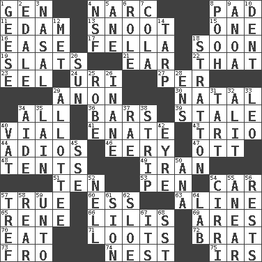 ACROSS 1. Commissioned military rank (abbr.) 4. Drug cop 8. Writing tablet 11. Dutch treat 13. Snob 15. Single 16. Relaxation 17. Chap (slang) 18. Within a short period 19. Narrow boards 21. Ewer handle 22. Not this but _ 23. Snakelike fish 24. RI univ. 27. For each 29. Soon (poet.) 30. Relating to or accompanying birth 34. 100% 36. Soap units 39. Lacking originality or spontaneity 40. Small bottle 41. Related on the mother's side 43. Musical group of three 44. Goodbye (Sp.) 46. Suggestive of the supernatural 47. Baseball player Mel 48. Portable shelters 49. SW Asia republic 51. Nine, plus one 53. Fenced enclosure 54. Automobile 57. Loyal 60. Double-curved letter 63. Place in a line 65. French philosopher Descartes 66. Ms. Damita and namesakes 69. Ancient Greek god of war 70. Erode 71. Plunders 72. Naughty child 73. From 74. Egg locale 75. Big collection agency DOWN 1. Honkers 2. Peak District village in England 3. Rhinal 4. Science/research agcy. 5. A saturated hydrocarbon 6. Hero or heavy, e.g. 7. Root beer relative 8. "Silly old bear" 9. Small Philippine buffalo 10. Gouge 12. Was introduced to 14. Canvas cover 18. Ski resort town in Vermont 20. Player for Phoenix 25. Loose flowing garment 26. Lacking in sense or substance 28. Followers of ems 29. One to whom something is allotted 31. Small pie 32. Came down and settled, as after flight 33. Lion 34. Helper 35. (Had) reclined 37. Actress Charlotte 38. Empty completely 40. Large container 42. Jane of fiction 45. Compass dir. 50. Santa ___, CA 52. 1994 drama film starring Jodie Foster 54. High-altitude cloud 55. Approach 56. Musical pauses 57. Unclean, religiously 58. Posterior 59. To (old English) 61. The Jewish people; Israel 62. _ gin 64. Experiment locale 67. ___ a Wonderful Life 68. Fast jet (abbr.)