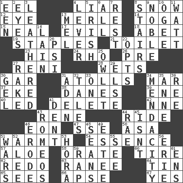 ACROSS 1. Snakelike fish 4. One who doesn't tell the truth 8. Frozen precipitation 12. Sight organ 13. Haggard of country music 14. Ancient Roman robe 15. Actress Patricia 17. Vices 18. Collude with 19. Paper fasteners 21. Rest room 23. Part of HMS, perhaps 24. 17th letter of the Greek alphabet 26. Before (prefix) 27. Painter Guido (1575-1642) 28. Moistens 30. Slender fish 31. Ringlike coral islands and reefs 34. Impair 37. Make supply last 38. Natives or inhabitants of Denmark 39. Compass dir. 40. Directed 41. Keyboard key 42. Compass dir. 43. French philosopher Descartes 44. Travel on or in a vehicle 46. A really long time 47. Compass dir. 50. White ___ sheet 51. Heat 54. Core 57. _ vera 58. Declaim 60. Become fatigued 62. Make new 63. The wife of a rajah (variant) 64. Shallow baking pan 65. Perceives with the eye 66. Domed church section 67. It is so DOWN 1. Car or cant ending 2. Snake ____ (dice throw) 3. Resembling or made to resemble leather 4. Prying instrument 5. From or relating to Ireland 6. 100% 7. Respite 8. Flight of steps 9. Impressive in appearance 10. Double curve, resembling the letter S 11. Electrical Unit 13. Cartoonist voice _ Blanc 16. (Had) reclined 20. Air pressure measure (abbr.) 22. Chooses 25. A small or young owl 27. Libertine 29. Otherwise 30. Set 31. An important port of Yemen 32. Falsehoods 33. Single 34. Ananias' fault 35. Queen of England 1702-14 36. To sift 41. Undesirable depression on a surface 43. Lover boys 44. Actress Charlotte 45. Is not 46. Wear away 48. Actors Connery and Penn 49. First name in cosmetics 51. Armed conflicts 52. Toward shelter 53. Israeli folk dance 55. Perceive with the eye 56. 4th largest of the Great Lakes 59. Strike 61. Followers of ems