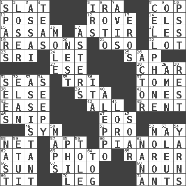 ACROSS 1. Narrow board 5. Retirement account (abbr.) 8. Police officer (slang) 11. Introduce or present, as a question 12. Be footloose 14. Raised railways 15. Indian state 17. Moving about 18. French article 19. Thinks logically 21. Bear (Spanish) 22. Car dealer's back yard 23. _ Lanka 24. Allow 25. Plant excrement 27. Compass dir. 28. Burn to charcoal 31. Oceans 35. Three (prefix) 37. Heavy book 38. Otherwise 39. R.R. building 41. Washington bills 42. Comfort 43. 100% 45. Monthly bill 46. Sever or remove by pinching or nipping 47. Greek goddess of the dawn 49. Symbol (abbr.) 51. Adept person 52. Fifth month 55. Fish or hair follower 57. Fitting 60. Player piano 62. _ moment's notice (2 wds.) 63. Picture 65. More uncommon 66. Player for Phoenix 67. Grain storage tower 68. Part of speech 69. Teat (slang) 70. Part of a journey 71. Pismires DOWN 1. Practice fights 2. Failure 3. Slender Brazilian palm 4. Beverages made from leaves 5. Big collection agency 6. Printing process, for short 7. Deliberation 8. Portable communications device 9. Margarine 10. Inconspicuous attention getter 13. Greek god of love 16. Undercover agent 17. Michaelmas daisies 20. A home for chicks 26. Thespian 29. So be it 30. Relief 31. Perceives with the eye 32. Liveliness 33. Helper 34. Not well drained, as in land 36. Call ___ day 40. City in Syria 44. Australian parrot (variant) 48. Fly high 50. Atlas contents 52. Person of subnormal intelligence 53. Native American of Southwest Alaska 54. Tall tales 55. Political cartoonist Thomas 56. Needle case 58. Silvers or Donahue 59. Lacquered or enameled metalware 61. Nanny 64. Coat; cloak