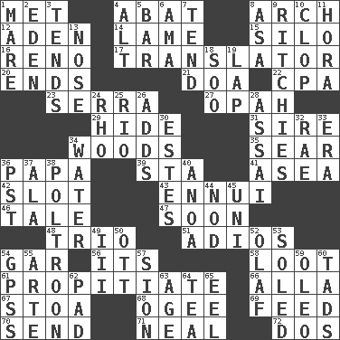 ACROSS 1. Was introduced to 4. Blind as ____ 8. Bowlike part 12. An important port of Yemen 14. Unable to walk 15. Grain storage tower 16. Western Nevada city 17. Interpreter 20. Conclusions 21. ___ good deed 22. Numbers guy (abbr.) 23. Spanish missionary in California 27. Brightly colored fish 29. Flintstone garb 31. Male parent of an animal 34. Forest 35. Shrivel 36. Dad 39. R.R. building 41. At sea 42. Position in a hierarchy or organization 43. World-weariness 46. Falsehood 47. Within a short period 48. Musical group of three 51. Goodbye (Sp.) 54. Slender fish 56. It is 58. Plunder 61. Appease 66. Silent film actress Nazimova 67. Portico 68. Double curve, resembling the letter S 69. Nourish 70. Post 71. Actress Patricia 72. Two (Sp.) DOWN 1. Female horse 2. Paradise 3. Looks after 4. The first octave above the treble staff 5. Long, evenly shaped piece 6. Nursemaid (var.) 7. Look after 8. White ___ sheet 9. Actors Guy, Robert Welles, and Clint 10. Hoof sound 11. Israeli folk dance 13. Olfactory organ 18. "Barney Miller" actor Jack 19. Pet locale 24. 17th letter of the Greek alphabet 25. _ de Janeiro 26. Sums up 28. Slender Brazilian palm 30. _____ Park, CO 32. Actress Charlotte 33. Epoch 34. Wetness 36. Pacific Standard Time (abbr.) 37. Wing 38. Characterized by complete cowardliness 40. Small Philippine buffalo 44. Lower and raise head in agreement 45. University (slang) 49. One more than two 50. Baseball player Mel 52. Norwegian king 53. Having a sole or soles 54. Global Positioning Systems (abbr.) 55. Johnson of "Laugh-In" 57. The Jewish people; Israel 59. Margarine 60. Small boys 62. Groovy apt. 63. Mature 64. Beverage made from leaves 65. Snakelike fish
