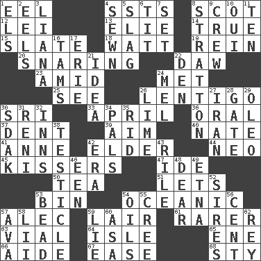 ACROSS 1. Snakelike fish 4. Fast planes 8. Highlander 12. Flowery wreath 13. Writer Wiesel 14. Loyal 15. Chalkboard 18. Electrical Unit 19. It's straight from the horse's mouth 20. Catching in a trap 22. Simpleton 23. Among 24. Was introduced to 25. Perceive with the eye 26. Small, flat, pigmented spot on the skin 30. Indian title of respect (Mr.) 33. Showery time 36. Of the mouth 37. Gouge 39. Direct toward a target or goal 40. Nathan's nickname 41. Singer Murray 42. A person who is older than you are 44. Modern: prefix 45. Smoochers 47. Binary compound 50. Afternoon social gathering 51. Allows 53. Storage container 54. Pertaining to the sea 57. Actor Baldwin 59. Den 61. More valued for its uncommonness 63. Small bottle 64. Capri or Wight 65. Compass dir. 66. Assistant 67. Relaxation 68. Filthy place DOWN 1. Raised railways 2. Snakelike fish 3. Climbing, woody, usually tropical vines 4. Stitched 5. Volcanic refuse 6. Teat (slang) 7. Put into a specified state 8. Ski resort town in Vermont 9. Group working together 10. Fr. "Yes" 11. "___ Little Indians" 16. Scottish caps 17. 4th largest of the Great Lakes 21. The main thing one is thinking about 22. Lair 24. Cartoonist voice _ Blanc 26. Citrus frut 27. SW Asia republic 28. Yard entry 29. Margarine 30. Neighbor of Neb. 31. Painter Guido (1575-1642) 32. Taverns 34. Friends 35. To free from 38. One of the two male reproductive glands 42. Period 43. Cause heat under the collar 46. Car or cant ending 48. Letter starter 49. Inactive volcano in Sicily 52. Fathers 53. Necklace unit 54. Petroleums 55. Algonquian 56. Penny 57. Actress Gardner 58. Cards in a Roman deck? 59. Untruth 60. White ___ sheet 62. Marina Del _, California