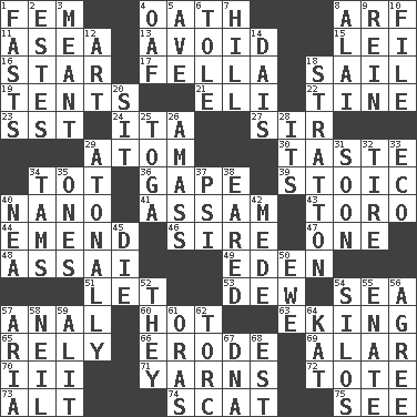 ACROSS 1. Opposite of masc. 4. Pledge 8. Sandy's bark 11. Toward the sea 13. Shun 15. Luau accessory 16. Play the lead 17. Man or boy (slang) 18. Travel by water 19. Portable shelters 21. Biblical high priest 22. Prong on a fork 23. Fast jet (abbr.) 24. Call ___ day 27. Title for a knight 29. Tiny particle 30. Clothes sense 34. Small child 36. Yawn 39. Unemotional 40. Billionth: prefix 41. Indian state 43. "Corrida" creature 44. Make improvements or corrections to 46. Title for a man of rank and authority 47. Single 48. Slender Brazilian palm 49. Genesis locale 51. Allow 53. Morning condensation 54. Ocean 57. Of or related to the anus 60. Being at a high temperature 63. Supplementing with great effort 65. Have trust in 66. Wear away 69. Having or resembling wings 70. One more than two 71. Tall tales 72. Carry 73. Keyboard modifier key 74. Leave at once 75. Perceive with the eye DOWN 1. Goes without food and/or water 2. _____ Park, CO 3. Intended 4. Clumsy lout 5. "___ Maria" 6. Lacquered or enameled metalware 7. Land elevation 8. Mountain range southwest of Kyrgyzstan 9. It's straight from the horse's mouth 10. Do some clerical work 12. Nonscientific branch of learning 14. Raised platform 18. Ski resort town in Vermont 20. Be seated 25. Ancient Roman robe 26. Collect or gather 28. ___ a Wonderful Life 29. Without tonality 31. Within a short period 32. Hoop that covers a wheel 33. Environmental prefix 34. Scottish caps 35. Singles 37. 23rd letter of the Greek alphabet 38. Having ears or earlike features 40. Teachers' org. 42. Ancient Persian 45. Pass on 50. She-sheep 52. Those things 54. Grain storage towers 55. Maternal 56. Match 57. Operatic vocal solo 58. Famous astronaut Armstrong 59. Set down 61. Mouths or openings 62. Torque (variant) 64. Krazy ___ of comics 67. Heredity factor (abbr.) 68. Eastern Standard Time (abbr.)