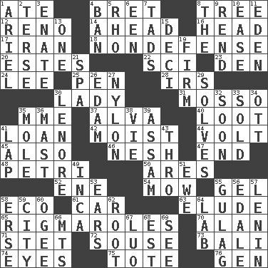 ACROSS 1. Had dinner 4. Cy Young winner Saberhagen 8. Woody plant 12. Former U.S. Attorney General Janet 14. Forward in time 16. Froth on beer 17. SW Asia republic 18. Unrelated to defense, as in spending 20. _____ Park, CO 22. _-fi 23. Lair 24. Area sheltered from the wind 25. Writing instrument 28. Big collection agency 30. Kenny Rogers chart-topper in '80 31. With motion or animation 35. Madame (abbr.) 37. Inventor's middle name 40. Spoils 41. Grant temporary use of 42. Damp 44. Electrical Unit 45. In addition 46. Tender 47. Conclusion 48. _ dish (used to culture cells) 50. Ancient Greek god of war 52. Compass dir. 54. Cut the grass 55. Set 58. Environmental prefix 61. 4-wheeled motor vehicle 63. Evade 65. Complicated, petty procedures 70. ____ Jay Lerner 71. Proofreading order 72. Boozer 73. Indonesian resort city 74. Snake ____ (dice throw) 75. Carryall 76. Commissioned mil. rank DOWN 1. Satellite of Uranus 2. Laconic 3. Related on the mother's side 4. Bar 5. 17th letter of the Greek alphabet 6. Car or cant ending 7. Bits 8. Definite Article 9. Tear apart 10. Relaxation 11. Genesis locale 13. Single 15. Tenth: prefix 19. Not soft or yielding to pressure 21. Health resort 26. Dutch treat 27. Thermoplastic polyamide 29. Finds the solution 30. Poe poem 32. Within a short period 33. Disposed of to a purchaser 34. Baseball player Mel 35. Undercover agent 36. Vertical spar for supporting sails 38. Compete 39. Indian state 41. Infant locale 43. Through, poetically 49. South American Indian 51. She-sheep 53. Hearing organs 55. POW camp 56. Peak District village in England 57. Soviet premier 1918-24 58. Celtic language 59. Municipality 60. Double curve, resembling the letter S 62. Carrot, for example 64. Experiment locale 66. Mountains (abbr.) 67. Nilotic language 68. Eastern Standard Time (abbr.) 69. Perceive with the eye