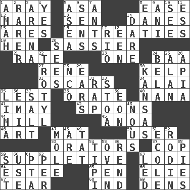ACROSS 1. Like ___ of sunshine 5. White ___ sheet 8. Relaxation 12. Female horse 13. Elected rep. 14. Natives or inhabitants of Denmark 15. Ancient Greek god of war 16. Pleas 19. Layer 20. More lively and spirited 21. Pace 23. Single 24. Sound made by sheep 27. French philosopher Descartes 30. Seaweed 31. Motion picture awards 34. Jai _ 35. For fear that 38. Speak pompously 40. Nanny 41. "If ____ say so..." 42. Soup utensils 44. Place where flour is made 45. Small Philippine buffalo 46. Nonscientific branch of learning 47. Floor covering 50. One who uses or employs something 53. Speakers 57. Police officer (slang) 59. Supplementary 63. Farming town in central California 64. First name in cosmetics 65. Fenced enclosure 66. Writer Wiesel 67. Pull apart 68. Working for oneself (abbr.) 69. Cub Scout units DOWN 1. Nursemaid 2. More valued for its uncommonness 3. Sports stadium 4. Affirmative reply 5. Toward the sea 6. Elected reps. 7. Pismires 8. Erode 9. Cuckoo 10. Perceive with the eye 11. Curvy letter 14. Have the gumption 17. River (Sp.) 18. Car or cant ending 20. Perceives with the eye 22. TNT 24. Actor Lugosi 25. ____ Jay Lerner 26. Capital of Western Samoa 28. Non-commissioned officer (abbr.) 29. Hearing organs 30. Sunflower state 32. Hit sharply and swiftly 33. Portico 35. Pale green bean 36. Arab leader 37. Table seasoning 39. Period of immesurable duration 43. Good sense 47. Undercover agent 48. "We ___ not amused" (Victoria) 49. Make lace 51. Learning spot: Fr. 52. "The Thinker" sculptor 54. Native american tent (variation) 55. Baking chamber 56. Tear apart 58. Sliced desserts 59. Arrange properly for use 60. Purpose 61. Parent Teacher Assoc. 62. For each 63. Directed
