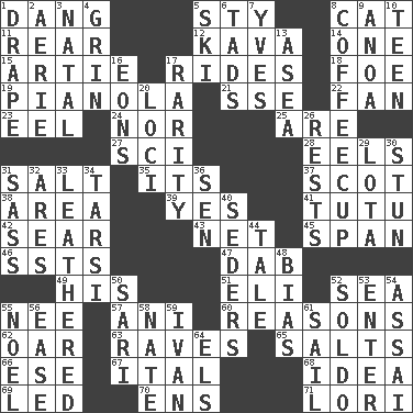 ACROSS 1. Mild oath, euphamism for damn 5. Filthy place 8. Feline 11. Bring up, as a child 12. Polynesian shrub of the pepper family 14. Single 15. Nick name for Arthur 17. Amusement-park features 18. Enemy 19. Player piano 21. Compass dir. 22. Avid follower 23. Snakelike fish 24. Not either 25. "We ___ not amused" (Victoria) 27. _-fi 28. Snakelike fish 31. Table seasoning 35. ___ a Wonderful Life 37. Native of Scotland 38. Length times width 39. Consenting reply 41. Ballerina skirt 42. Singe 43. Remaining after all deductions 45. Connect, as a bridge 46. Fast planes 47. Pat or tap gently 49. Part of HMS, perhaps 51. Connecticut Ivy Leaguer 52. Ocean 55. Born 57. Cuckoo 60. Thinks logically 62. Boat paddle 63. All-night dance parties 65. Table seasonings 66. Compass dir. 67. Slanted text style (abbr.) 68. The content of cognition 69. Directed 70. Followers of ems 71. Australian parrot (variant) DOWN 1. Window treatment 2. Nest on high 3. Brizilian seaport 4. Amused look 5. What Jean-Claude Killy likes to do 6. Small amounts or degrees 7. Jacques Cousteau's middle name 8. Java holder (2 wds.) 9. Small Philippine buffalo 10. Adolescent 13. At sea 16. Immeasurably long periods of time 17. Noteworthy scarcity 20. Venues 26. Musical pauses 29. Globular water bottle used in Asia 30. Surprise greatly 31. Backtalk 32. Ancient Greek god of war 33. Tough but pliablecoriaceous 34. Tarsus (plural) 36. Elected rep. 40. Spring feasts 44. Story 48. Prejudice 50. Indian skirt 52. Twentieth part of a lira 53. Keyboard key 54. Slender Brazilian palm 55. Christmas carol 56. Comfort 58. Nathan's nickname 59. "Terrible" tsar 61. Move on water 64. Raised railways