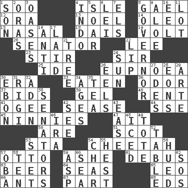 ACROSS 1. "Barney Miller" actor Jack 4. Small island 8. Highlander 12. Mouth or opening 13. Christmas carol 14. Butter sub 15. Relating to the nose 18. Raised platform 19. Electrical Unit 20. Legislator 22. Area sheltered from the wind 23. Disorderly outburst 24. Title for a knight 25. Binary compound 26. Normal relaxed breathing 30. Period 33. Consumed 36. Aroma 37. Auction offers 39. Set 40. Monthly bill 41. Double curve, resembling the letter S 42. Gospel singer Marvin 44. Compass dir. 45. Simpletons 47. Small island 50. "We ___ not amused" (Victoria) 51. Native of Scotland 53. R.R. building 54. Leopard's kin 57. "Beetle Bailey" pooch 59. American tennis player Robert 61. Alight from a bus 63. Fermented drink made from hops 64. Oceans 65. Lion 66. Pismires 67. Role in a play 68. Begley and Asner DOWN 1. Manchild 2. Mouths or openings 3. Fertile tracts in a desert 4. _ china 5. Fly high 6. Flowery wreath 7. Raised railways 8. State head 9. _ vera 10. Snakelike fish 11. Car dealer's back yard 16. Opposed to 17. Put down 21. Relationship diagram 22. Mouth edge 24. Player for Phoenix 26. Snakelike fish 27. Lyric poems 28. Immeasurably long periods of time 29. Johnson of "Laugh-In" 30. Inky black, to poets 31. Swiss mountan, "Queen of the Mountains" 32. Arabian gulf 34. Grows older 35. Beverage made from leaves 38. Elected representatives 42. Observe 43. Relaxation 46. Retirement account (abbr.) 48. On the rocks 49. Carryall 52. Eating place 53. Proofreading order 54. Burn to charcoal 55. Behest 56. Took on color 57. Chief or king in Benin or Nigeria 58. "___ Little Indians" 59. Viper 60. Ocean 62. Mayday