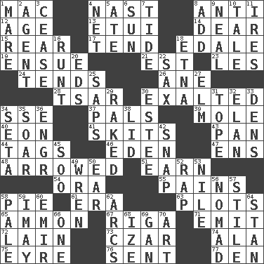 ACROSS 1. Apple computer (short form) 4. Political cartoonist Thomas 8. Opposed to 12. Ripen 13. Needle case 14. Letter starter 15. Posterior 17. Be inclined (to) 18. Peak District village in England 19. Take place subsequently 21. Eastern Standard Time (abbr.) 23. French article 24. Watches over 26. A saturated hydrocarbon 28. Russian ruler of old 30. Honored 34. Compass dir. 37. Friends 39. Undercover agent 40. Period of immesurable duration 41. Burlesque acts 43. Baking dish 44. Labels 46. Locale of original sin 47. Followers of ems 48. Moved like an arrow 51. Merit 54. Mouth or opening 55. Aches 58. Sliced dessert 61. Period 63. Graphs 65. ID or VA city 67. Port city in Latvia 71. Send forth 72. (Had) reclined 73. Russian ruler of old 74. Wing 75. Jane of fiction 76. Emitted 77. Lair DOWN 1. Female horse 2. Rep 3. Desist 4. Remaining after all deductions 5. Had dinner 6. Player for Phoenix 7. Event that recurs at intervals 8. Increase 9. Anneal 10. Story 11. Angers 16. Undersized animal 18. Inactive volcano in Sicily 20. Begley and Asner 22. Saxophone 25. Plant excrements 27. Shade tree 29. Swept the length of 30. First name in cosmetics 31. Drink excessively 32. Liveliness 33. Lairs 34. Stalk of a moss capsule 35. Fly high 36. Engineer (abbr.) 38. Hat (slang) 42. Fastener 45. "Barney Miller" actor Jack 49. Songbird 50. Hearing organ 52. Strike 53. Mediterranean tributary 56. Wanderer 57. Vertical member of a panel or frame 58. Diluted with white 59. "If ____ say so..." 60. Arab leader 62. Arches 64. Comedian Laurel of Laurel & Hardy 66. Single 68. Ending with capital 69. Separate the seeds from cotton 70. Tate display
