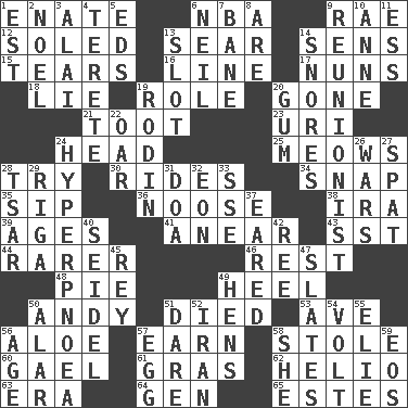 ACROSS 1. Maternal 6. Basketball assoc. 9. Actress Charlotte 12. Having a sole or soles 13. Scorch 14. Elected reps. 15. Separates forcefully 16. Actor's bit 17. Religious women 18. Whopper 19. Hero or heavy, e.g. 20. Went 21. A blast of a horn 23. RI univ. 24. Froth on beer 25. Catcalls? 28. Attempt 30. Amusement-park features 34. Fastener 35. Small drink 36. Trap for birds or small mammals 38. Lyricist Gershwin 39. Ripens 41. Approach 43. Fast jet (abbr.) 44. More valued for its uncommonness 46. Respite 48. Sliced dessert 49. Person who is morally reprehensible 50. Actor Griffith 51. Passed on 53. "___ Maria" 56. _ vera 57. Merit 58. Took without asking 60. Highlander 61. Pate de foie ____ 62. Sun: prefix 63. Epoch 64. Commissioned mil. rank 65. _____ Park, CO DOWN 1. Eastern Standard Time (abbr.) 2. Christmas carol 3. Jai _ 4. Cigar-shaped 5. Begley and Asner 6. Famous astronaut Armstrong 7. Object of repulsion 8. "We ___ not amused" (Victoria) 9. One who advocates reunion 10. Queen of England 1702-14 11. Double-curved letter 13. Narrow opening 14. Sounds asleep 19. "The Thinker" sculptor 20. Chewing product 22. Rowing implement 24. Abnormally rapid or deep breathing 26. Armed conflicts 27. Argument over a trivial matter 28. Russian ruler of old 29. Capital of Latvia 31. ___ good deed 32. A really long time 33. Compass dir. 37. Having ears or earlike features 40. Beer mug 42. To sift 45. Marina Del _, California 47. Chalkboards 49. Coop moms 50. Having or resembling wings 51. Have the gumption 52. SW Asia republic 54. Electrical Unit 55. Writer Wiesel 56. Ripen 57. Ovum 58. A female animal or person 59. Greek goddess of the dawn