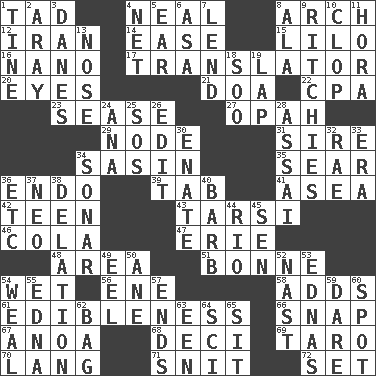 ACROSS 1. Bit 4. Be tempered by heat 8. Bowlike part 12. SW Asia republic 14. Relaxation 15. _ and Stitch 16. Billionth: prefix 17. Interpreter 20. Sight organs 21. ___ good deed 22. Accounting whiz (abbr.) 23. Gospel singer Marvin 27. Brightly colored fish 29. Connecting point 31. Male parent of an animal 34. Indian antelope 35. Scorch 36. Inside; within (prefix) 39. Bar bill 41. At sea 42. Adolescent 43. Tarsus (plural) 46. Root beer relative 47. One of the Great Lakes 48. Length times width 51. Child's nurse 54. Soggy 56. Compass dir. 58. Sums up 61. The property of being fit to eat 66. Fastener 67. Small Philippine buffalo 68. Tenth: prefix 69. Pacific island yam 70. Austrian-born American filmmaker Fritz 71. In a ____ (agitated or irritated) 72. Arrange properly for use DOWN 1. Prong on a fork 2. Like ___ of sunshine 3. Natives or inhabitants of Denmark 4. Fish or hair follower 5. Ewer handle 6. White ___ sheet 7. Grant temporary use of 8. According to 9. Actors Guy, Robert Welles, and Clint 10. Hoof sound 11. Israeli folk dance 13. Characteristic smell of wine 18. "Barney Miller" actor Jack 19. Pet locale 24. Santa ___, CA 25. Mayday 26. Prepare for publication 28. Slender Brazilian palm 30. Maternal 32. Actress Charlotte 33. Period 34. Echolocation 36. And so on (abbr.) 37. Modern: prefix 38. Accusation by an informer 40. Sharp remark 44. River (Sp.) 45. Elected rep. 49. Snakelike fish 50. A saturated hydrocarbon 52. Political cartoonist Thomas 53. Ferber et al. 54. Welt 55. Pulitzer Prize-winning author Ferber 57. Conclusions 59. Have the gumption 60. Specific locale 62. Container for groceries 63. Car or cant ending 64. _-fi 65. Be seated