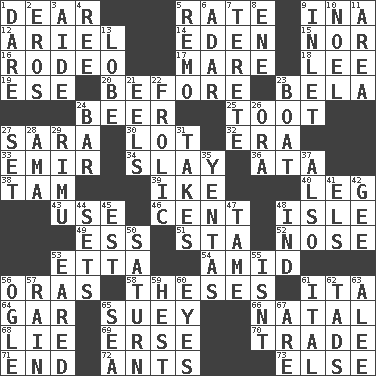 ACROSS 1. Letter starter 5. Assign a rank or rating to 9. _ tizzy (2 wds.) 12. Satellite of Uranus 14. Locale of original sin 15. And not 16. Cowboy competition 17. Female horse 18. Area sheltered from the wind 19. Compass dir. 20. Prior to 23. Actor Lugosi 24. Fermented drink made from hops 25. A blast of a horn 27. "Two Mules for Sister ____" 30. Car dealer's back yard 32. Epoch 33. Independent ruler or chieftain 34. Kill 36. "One Day ___ Time" 38. Scottish cap 39. Mamie's husband 40. Part of a journey 43. Purpose 46. Penny 48. Capri or Wight 49. Double-curved letter 51. R.R. building 52. Sense of smell 53. Singer James 54. Among 56. Mouths or openings 58. College papers 61. Call ___ day 64. Slender fish 65. Chop _ 66. Relating to or accompanying birth 68. Untruth 69. Celtic language 70. Exchange 71. Conclude 72. Pismires 73. Otherwise DOWN 1. Have the gumption 2. Greek god of love 3. Assistant 4. To riddle 5. San ____ (Riviera town) 6. The sixth month of the Jewish calendar 7. Cylindrical with tapered ends 8. Compass dir. 9. An arm off of a larger body of water 10. Christmas carol 11. Type of rug 13. Ear part 21. Snakelike fish 22. Play 23. Water vessel 24. Drinking establishment 26. Mouth or opening 27. Put into a specified state 28. Housemaid (var.) 29. Tall New Zealand timber tree 31. Receives possession of 35. Gossips 37. In addition 41. Raised railways 42. Turn to the right 44. Arranges properly for use 45. Eastern Standard Time (abbr.) 47. Not wild 48. Indiana (abbr.) 50. Titan orbits this 53. Having ears or earlike features 55. Is not 56. Stare at amorously 57. Water falling in drops from the sky 59. Behest 60. Snake ____ (dice throw) 61. Slanted text style (abbr.) 62. Small boys 63. Toward shelter 65. Ocean 67. "We ___ not amused" (Victoria)