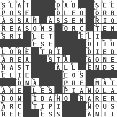 ACROSS 1. Narrow board 5. Apply (a substance) by light strokes 8. Perceive with the eye 11. Introduce or present, as a question 12. Margarine 14. Globe 15. Indian state 17. NE Netherlands city 18. River (Sp.) 19. Thinks logically 21. The grampus (Milton) 22. "___ Little Indians" 23. _ Lanka 24. Allow 25. Connecticut Ivy Leaguer 27. Compass dir. 28. Von Bismarck 31. Old wives' tales, e.g. 35. Three (prefix) 37. Passed on 38. Type of rug 39. R.R. building 41. Went 42. Vertical spar for supporting sails 43. 100% 45. Conclusions 46. Writer Wiesel 47. Greek goddess of the dawn 49. Heredity factor (abbr.) 51. Before (prefix) 52. Floor protector 55. Deep reverence 57. French article 60. Player piano 62. Spanish title 63. Potato state 65. Less widely known 66. Curve 67. Native american tent (variation) 68. Common sense 69. To riddle 70. Curvy letter 71. Opposed to DOWN 1. Practice fights 2. Failure 3. Slender Brazilian palm 4. Beverages made from leaves 5. Two (Sp.) 6. In addition 7. Fermented drink made from hops 8. Drawing lots 9. 4th largest of the Great Lakes 10. Inky black, to poets 13. Single time 16. Undercover agent 17. Michaelmas daisies 20. Egg locale 26. Cabin 29. Be inclined (to) 30. Lyric poems 31. Unable to walk 32. Of the mouth 33. Home 34. Eroded 36. Call ___ day 40. City in Syria 44. Australian parrot (variant) 48. Dry up 50. Came down and settled, as after flight 52. Person of subnormal intelligence 53. Eskimo relative 54. Tarsus (plural) 55. The sixth month of the Jewish calendar 56. Had on 58. Singer Brickell 59. Plant excrements 61. Nanny 64. Part of HMS, perhaps