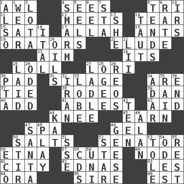 ACROSS 1. Leather borer 4. Observes 8. Three (prefix) 11. Lion 12. Confronts 14. Separate forcefully 15. Suttee (variant) 17. Assad's deity 18. Pismires 19. Speakers 21. Dodge 23. Direct toward a target or goal 24. It is 25. Hang loosely or laxly 27. Australian parrot (variant) 30. Writing tablet 31. Fodder prepared in a silo 34. "We ___ not amused" (Victoria) 37. Make a knot 38. Cowboy competition 39. Daniel's nick name 40. Find the sum of 41. Most capable 43. Assist 44. Leg joint 45. Merit 47. Health resort 49. Set 50. Table seasonings 52. Elected representative 56. Inactive volcano in Sicily 57. Snake scale 60. Connecting point 61. Municipality 62. Ferber et al. 63. French article 64. Mouth or opening 65. Male parent of an animal 66. Eastern Standard Time (abbr.) DOWN 1. In addition 2. Erode 3. Globular water bottle used in Asia 4. Excessive but superficial compliments 5. Snakelike fish 6. Snakelike fish 7. R.R. building 8. Watches over 9. Pace 10. Big collection agency 13. A female animal or person 14. Tense 16. Slanted text style (abbr.) 20. Petroleums 22. Cards in a Roman deck? 25. Put down 26. Wrote a lyric poem 27. Dipping utensil 28. Double curve, resembling the letter S 29. Vintage cars 30. Parent Teacher Association (abbr.) 32. SW Asia republic 33. Ear part 34. The sixth month of the Jewish calendar 35. Water falling in drops from the sky 36. Conclude 42. Adolescent 44. Krazy ___ of comics 46. Actor Alda or Thicke 47. Before Barbara or Clara 48. Live dramatic performance 49. Honkers 50. Tumult 51. Compass dir. 52. Play the lead 53. Lacquered or enameled metalware 54. Lyric poems 55. Take ten 56. Environmental prefix 58. Music discs 59. University (slang)