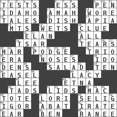 ACROSS 1. Trials 6. Curvy letter 9. Animal enclosure 12. Potato state 13. Nanny 14. Had on 15. Lies 16. Food container 17. Capital of Western Samoa 18. Mountains (abbr.) 19. Moistens 20. A slight indication 21. Enthusiasm 23. 100% 24. Russian ruler of old 25. Lacerates 28. Spoil 30. Porridge 34. Musical group of three 35. Epoch 36. Olfactory organs 38. Wedding promise 39. Habitations of wild animals 41. Vegetable dish 43. "___ Little Indians" 44. Artist's stand 46. Made of lace 48. Area sheltered from the wind 49. Inactive volcano in Sicily 50. Bits 51. Hats (slang) 53. Big _ 56. Lug 57. Australian parrot (variant) 58. Major League Baseball Commissioner Bud 60. Russian composer Stravinsky 61. Blind as ____ 62. Feeling or showing extreme anger 63. Hearing organ 64. Benjamin's nick name 65. Indian princess (variant) DOWN 1. Teat (slang) 2. Dutch treat 3. Table seasoning 4. College papers 5. Distress signal 6. Send forth 7. Backtalk 8. Quiet! 9. Teen's desire 10. 4th largest of the Great Lakes 11. Teachers' org. 13. Arabian gulf 14. Place for singles 19. Make _____ (do battle with) 20. Domesticated feline 22. Pet locale 24. Interpreter 26. Travel on an animal 27. Within a short period 28. Ancient Persian 29. Type of rug 31. Two (Sp.) 32. Girls' org. (abbr.) 33. Snakelike fish 37. Table seasonings 40. Sowing specialist 42. One of the 12 tribes of Israel 45. French article 47. Device for capturing images 49. Prepare for publication 50. Ancient Roman robe 51. Ear part 52. SW Asia republic 54. ____ Jay Lerner 55. Quote 56. Neckwear 57. Experiment locale 58. Title for a knight 59. Unit of force equal to gravity