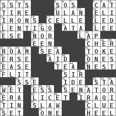 ACROSS 1. Fast planes 5. Distress signal 8. Feline 11. Hoop that covers a wheel 12. ____ Bator, Mongolia 14. Connecticut Ivy Leaguer 15. Metal shackles 17. Cell (Danish) 18. Directed 19. Small, flat, pigmented spot on the skin 21. _ moment's notice (2 wds.) 22. Area sheltered from the wind 23. Compass dir. 24. And not 25. Pet locale 27. Car or cant ending 28. "Mermaids" star 31. Wander 35. Ocean 37. Puff or smoke 38. Celtic language 39. Help 41. Singles 42. Comfort 43. Afternoon social gathering 45. A home for chicks 46. Sudden quick movement 47. Title for a knight 49. Compass dir. 51. Binary compound 52. R.R. building 55. Soggy 57. Curvy letter 60. Elected representative 62. Epoch 63. It is permitted: Lat. 65. Resident of Iraq 66. Metal container 67. Cole _ (cabbage dish) 68. A slight indication 69. Put into a specified state 70. Single 71. Person who is morally reprehensible DOWN 1. Vertical member of a panel or frame 2. Titles for men of rank and authority 3. Marketplace scale 4. Transmitted 5. Institute legal proceedings 6. Water jar 7. Table seasoning 8. Portable communications device 9. Toward shelter 10. Event that recurs at intervals 13. Anneal 16. Trig term 17. Pupil covering 20. Moves 26. 13-14th century defensive garment 29. Supplements with great effort 30. Respite 31. Coral ridge 32. Spoken 33. Helper 34. Confronts 36. Small island 40. Cease 44. Assistant 48. Painter Guido (1575-1642) 50. Snakelike fish 52. Showing deterioration from age 53. Woman's close-fitting hat 54. Satellite of Uranus 55. Moistens 56. 4th largest of the Great Lakes 58. Grain storage tower 59. Skim 61. Bowlike part 64. She-sheep