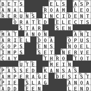 ACROSS 1. Wagers 5. Raised railways 8. Viper 11. Of or related to the anus 12. Wander aimlessly 13. Lion 14. Summer TV shows 17. Event 19. Declaimed 21. Opts 22. Play the lead 23. Elected rep. 24. Floor covering 27. Soon (poet.) 29. Cuckoo 32. Satellite of Uranus 34. ___ good deed 36. Musical composition 37. Republicans 38. Followers of ems 39. Christmas carol 40. Naughty children 41. Put into a specified state 42. Boldness 43. Island 44. Through, poetically 46. Small child 47. Shoshoni 50. Chow _ 52. Went by 55. Sunflower state 57. Electrical Measurement 59. Cease 62. Sliced dessert 63. Volcanic refuse 64. Small Philippine buffalo 65. Find the sum of 66. Car or cant ending 67. Grant temporary use of DOWN 1. Tavern 2. Compass dir. 3. Pacific island yam 4. Disparaging remarks 5. A really long time 6. Shoestrings 7. Grin 8. Actor Baldwin 9. Posted 10. Plant holders 12. To free from 15. Brizilian seaport 16. Comedian Laurel of Laurel & Hardy 18. Lair 20. Eats (away) 24. Mysterious quality of enchantment 25. Scent 26. Likely to tip or tilt 28. Music written for nine 29. To the left, to Queeg 30. New (sp.) 31. Small island 33. Curvy letter 35. Respiratory problem 36. Single 42. Annoying sound 45. Tear apart 47. Purpose 48. Laconic 49. Peak District village in England 51. Relating to the nose 52. Dad 53. Among 54. Broke a traffic law 55. Cask 56. Trig term 58. Separate the seeds from cotton 60. Boy, to dad 61. Bit